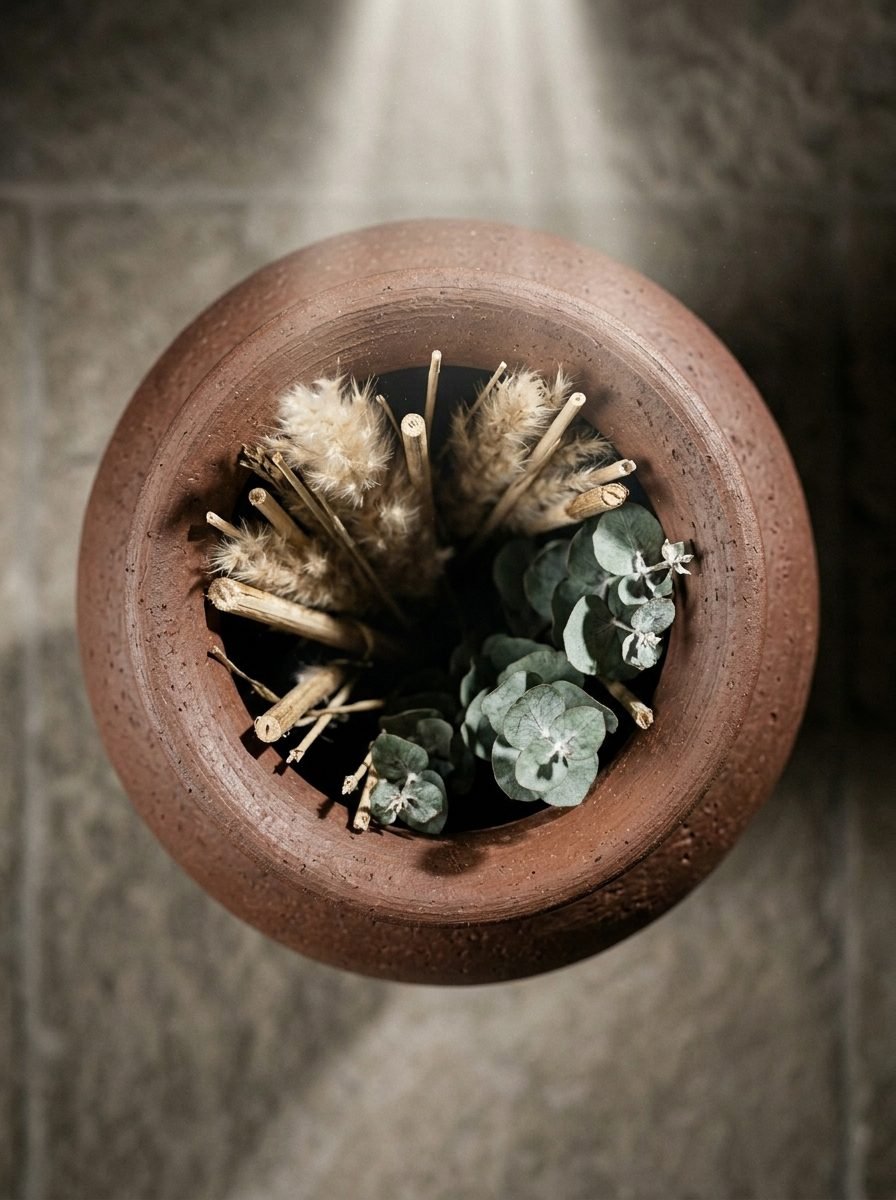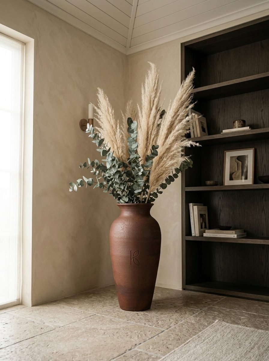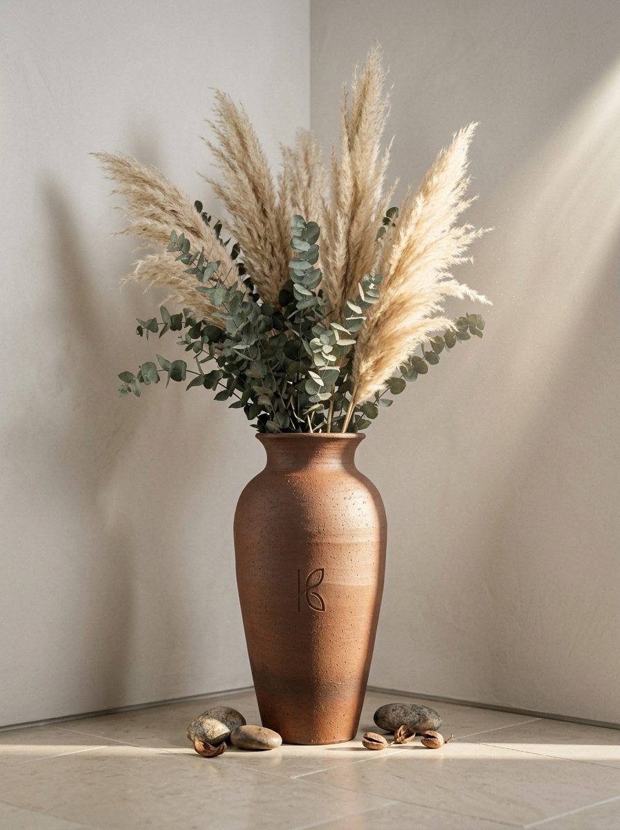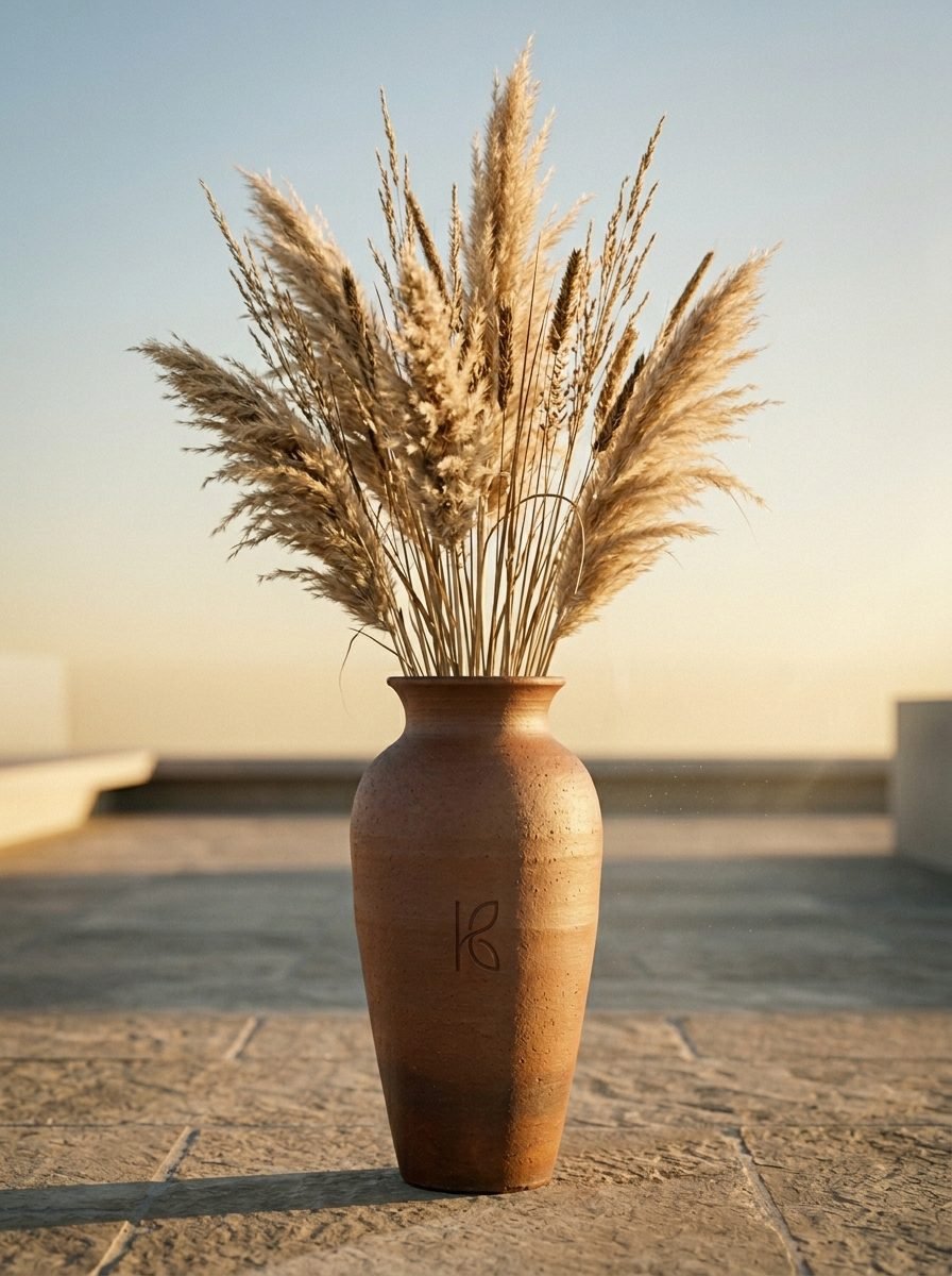 For the classic abundant look: 5–7 pampas grass plumes at 80–100cm above the vase rim. For a more minimal look: 2–3 plumes at varying heights. The clay vase’s scale means that under-filling with just 1–2 stems can look sparse; 5–7 creates the full, confident arrangement.