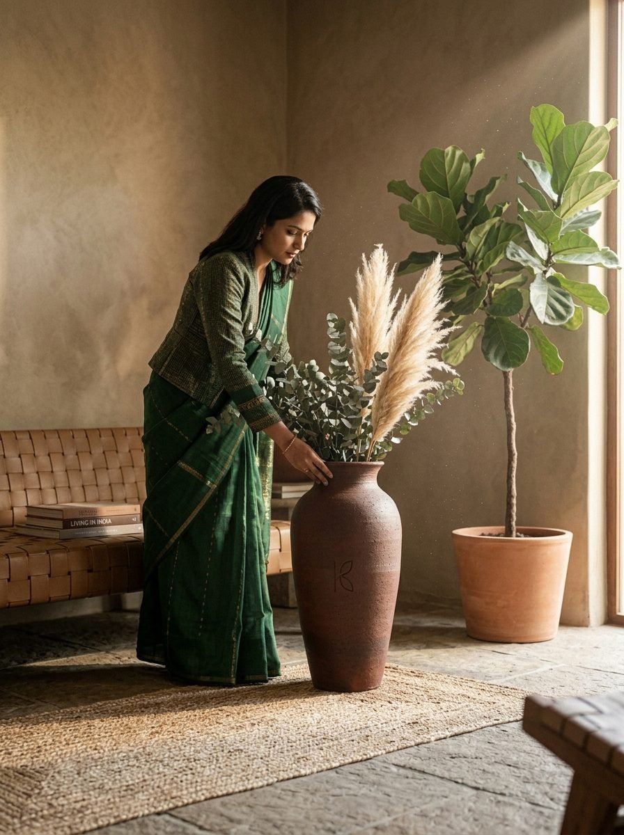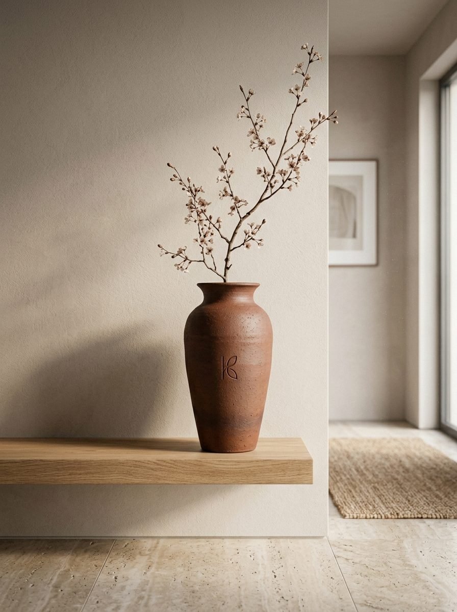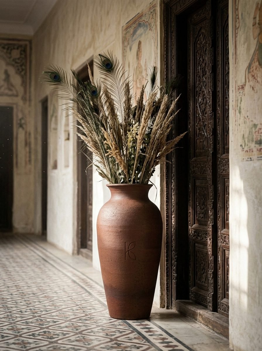 The 40cm vase is the one Klayvi product that is most overtly an art object. The proportions, the height, the colour gradient from the kiln — at this scale, the clay vase is not just a vessel. It is a made object that occupies a room. The standard is comparable to decorative objects from Good Earth, Nicobar, or premium international ceramics brands — objects chosen for their material quality and visual presence, not just their function. The Science The visual impact of a 40cm clay vase with dried pampas in a room is a specific and measurable biophilic cue: natural material object (clay) + natural organic form (pampas grass) + vertical movement in the field of vision (the pampas swaying slightly in air currents) = maximum biophilic stimulus density in one corner of a room. Research on biophilic design consistently finds that vertical natural elements (tall plants, tall natural material objects) are particularly effective at the entry points of a room where the first visual impression is formed.