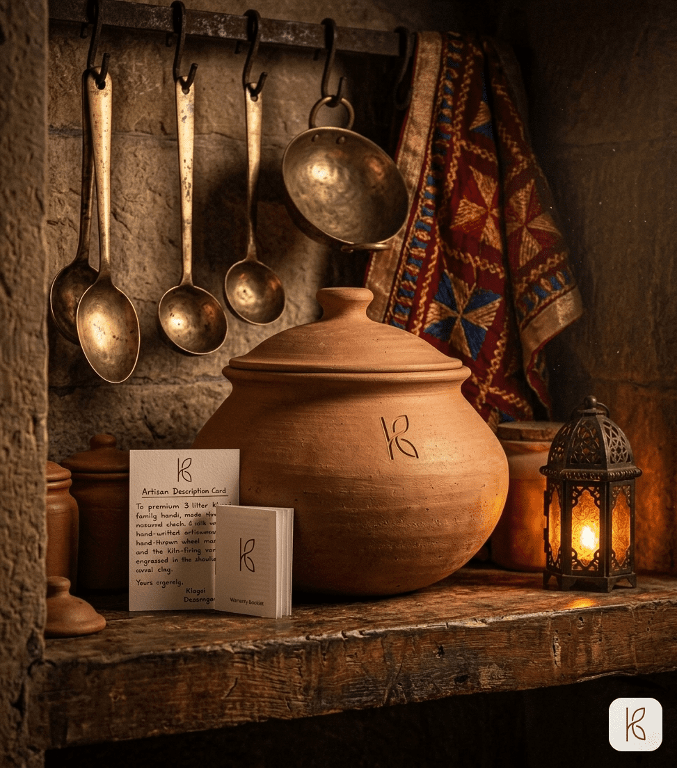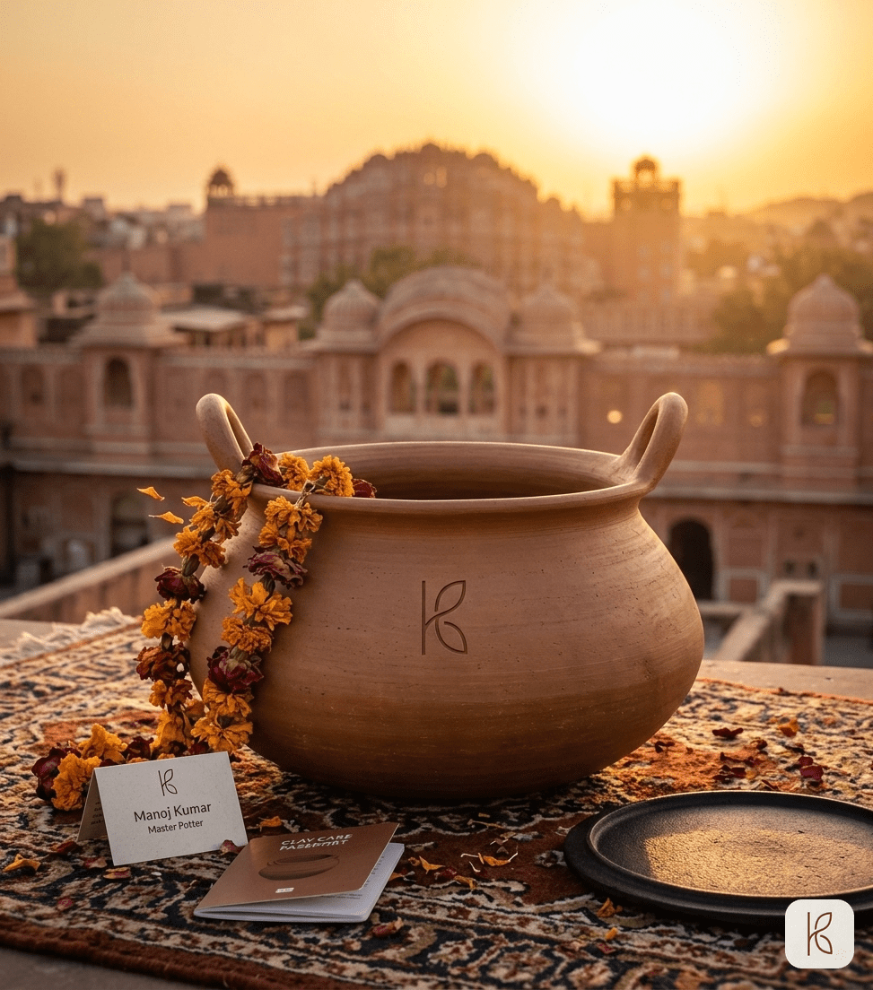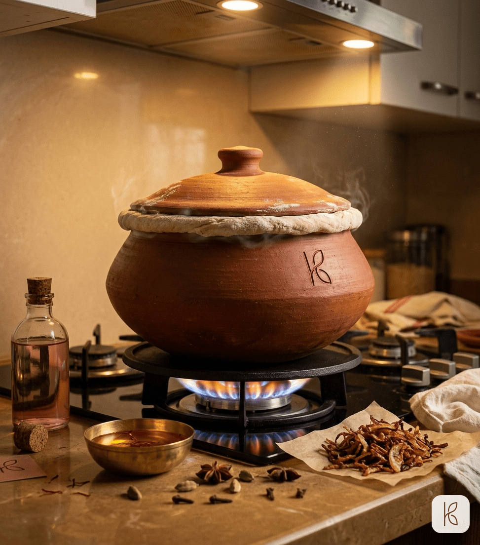 Three litres of ICP-OES tested terracotta clay. Named artisan card. Cast iron heat diffuser. Steel induction adapter. 3-year structural warranty. The pot you buy once and keep for two decades — for the Sunday biryani, the Eid feast, the dinner that becomes a memory.