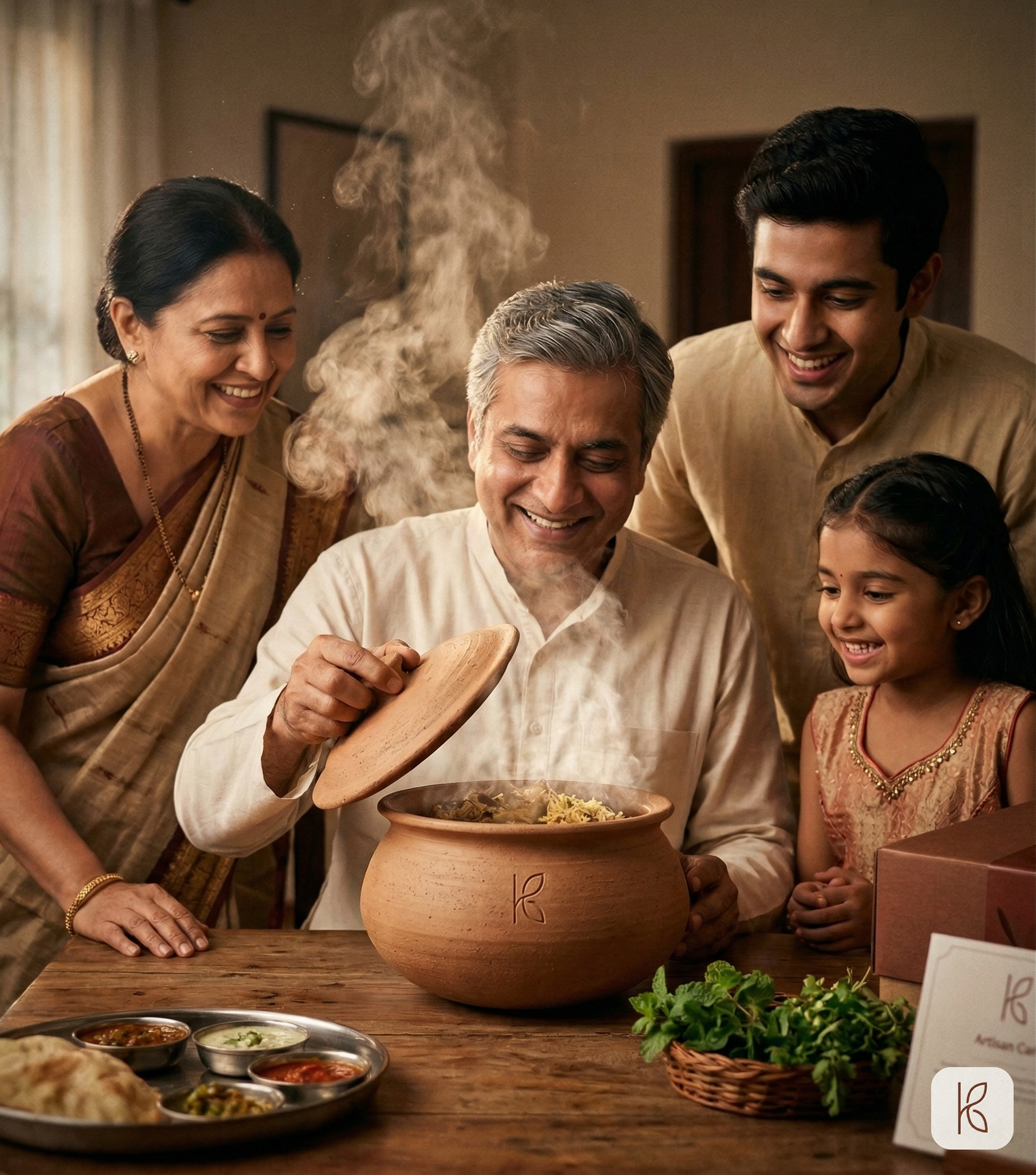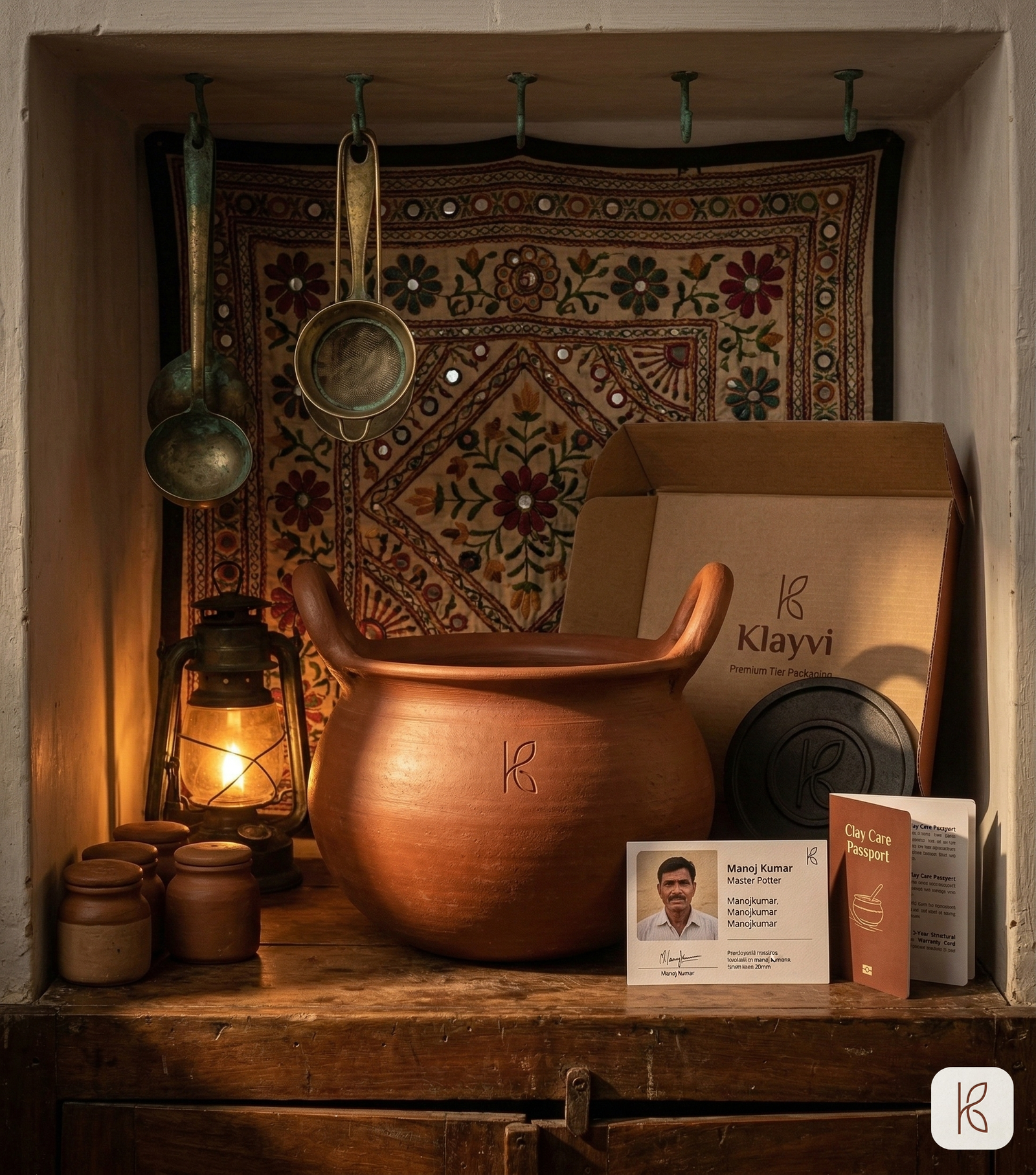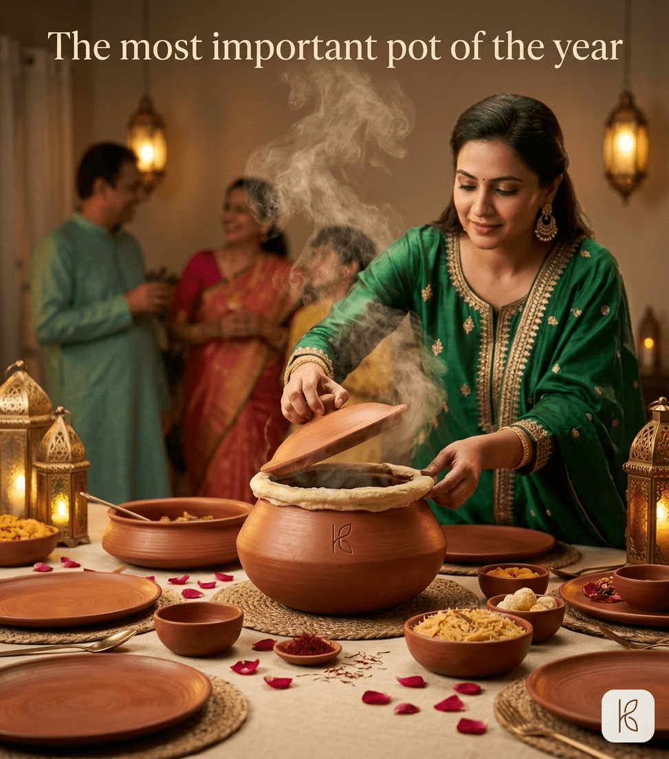 Three litres of ICP-OES tested terracotta clay. Named artisan card. Cast iron heat diffuser. Steel induction adapter. 3-year structural warranty. The pot you buy once and keep for two decades — for the Sunday biryani, the Eid feast, the dinner that becomes a memory.