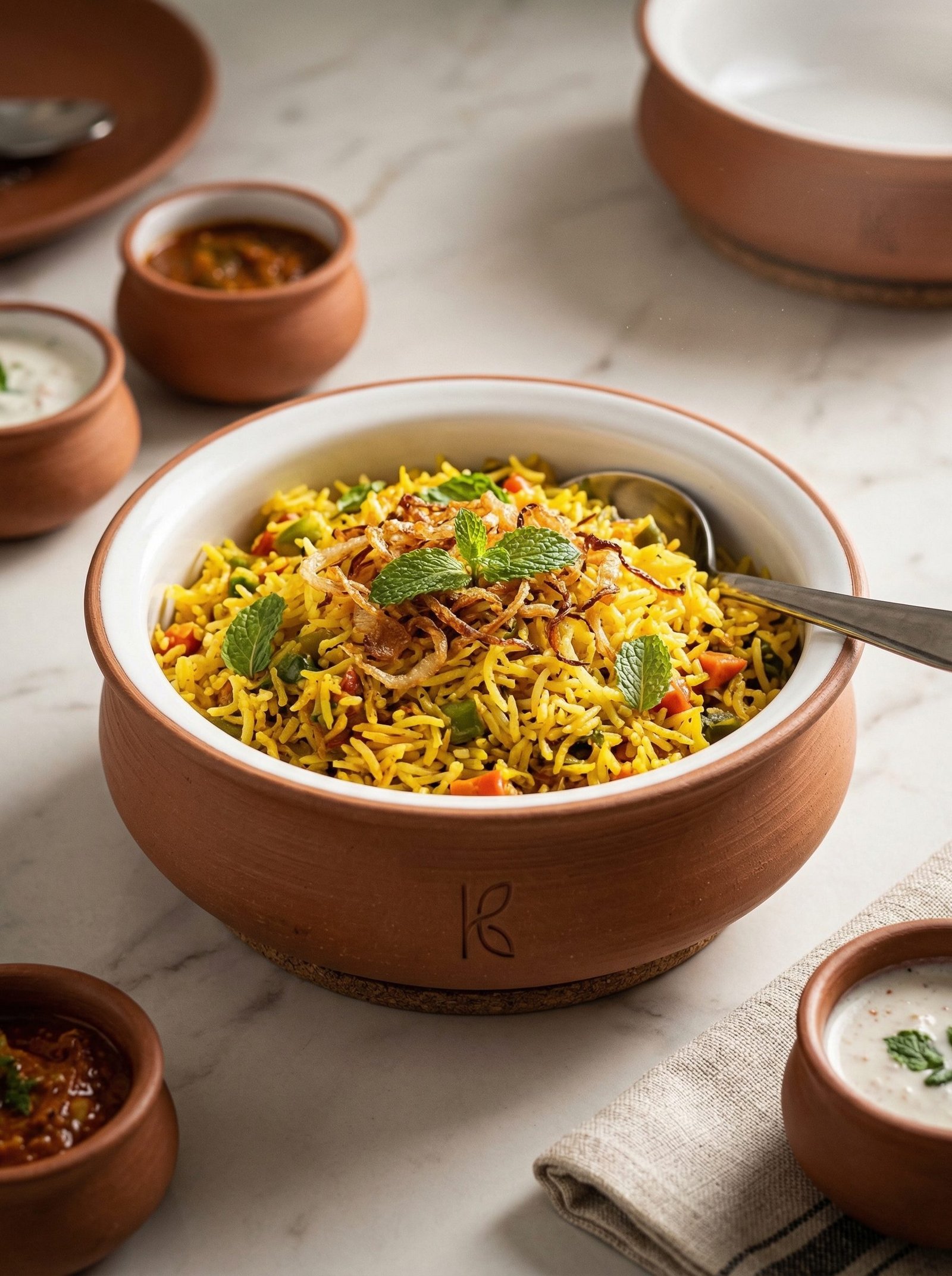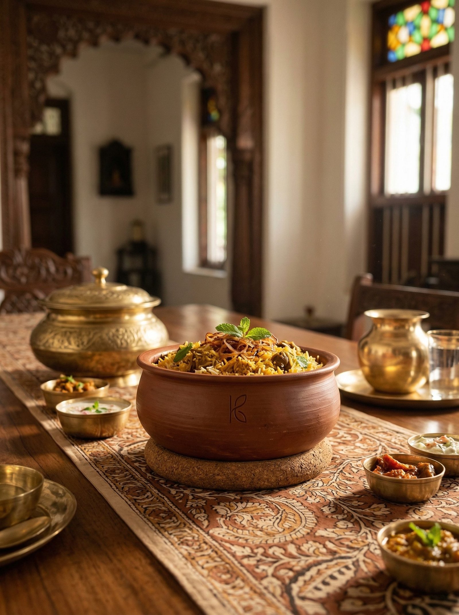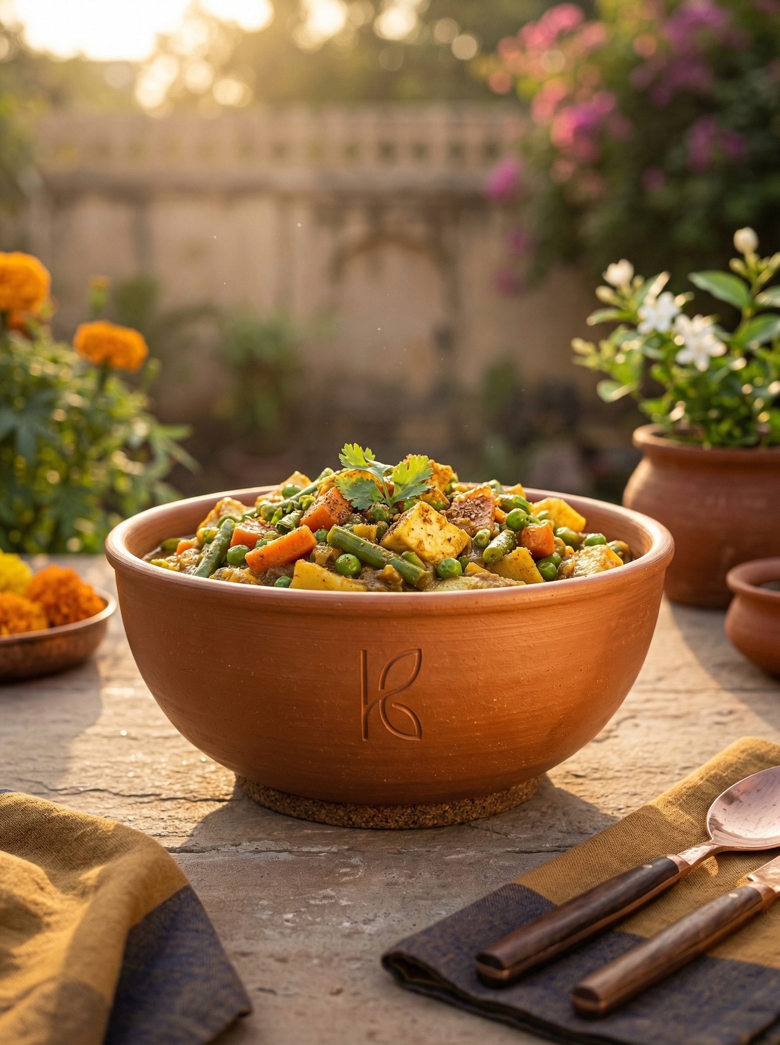 A 1-litre open serving bowl that bridges cookware and tableware. Large enough to hold the entire batch of sabzi for four people. Goes directly from low stovetop heat to the dining table. Bone Kaolin cream interior glaze. Natural terracotta exterior. XRF-certified. The clay bowl that keeps sabzi warm through the meal, not just the first five minutes.
