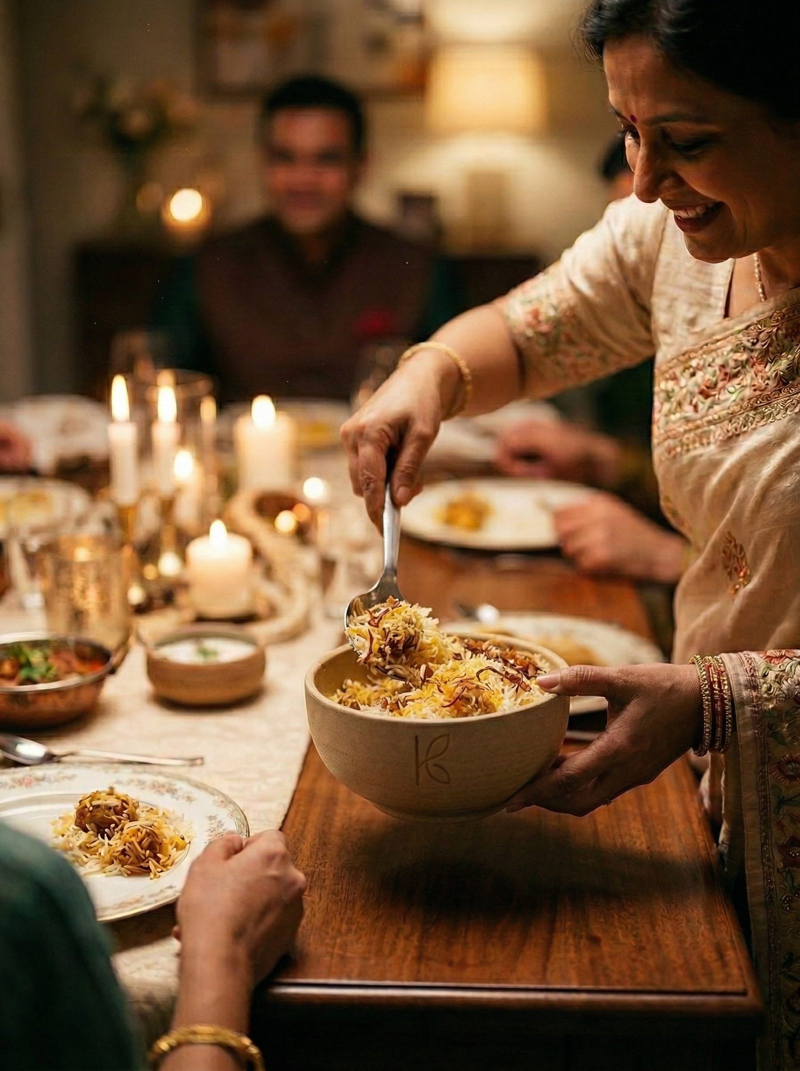 Yes — 1L is approximately the right serving size for biryani for 2–3 people as a sharing bowl. The wide opening makes it easy to serve from. For a full family biryani presentation, the 2L serving bowl is more appropriate for the centrepiece.