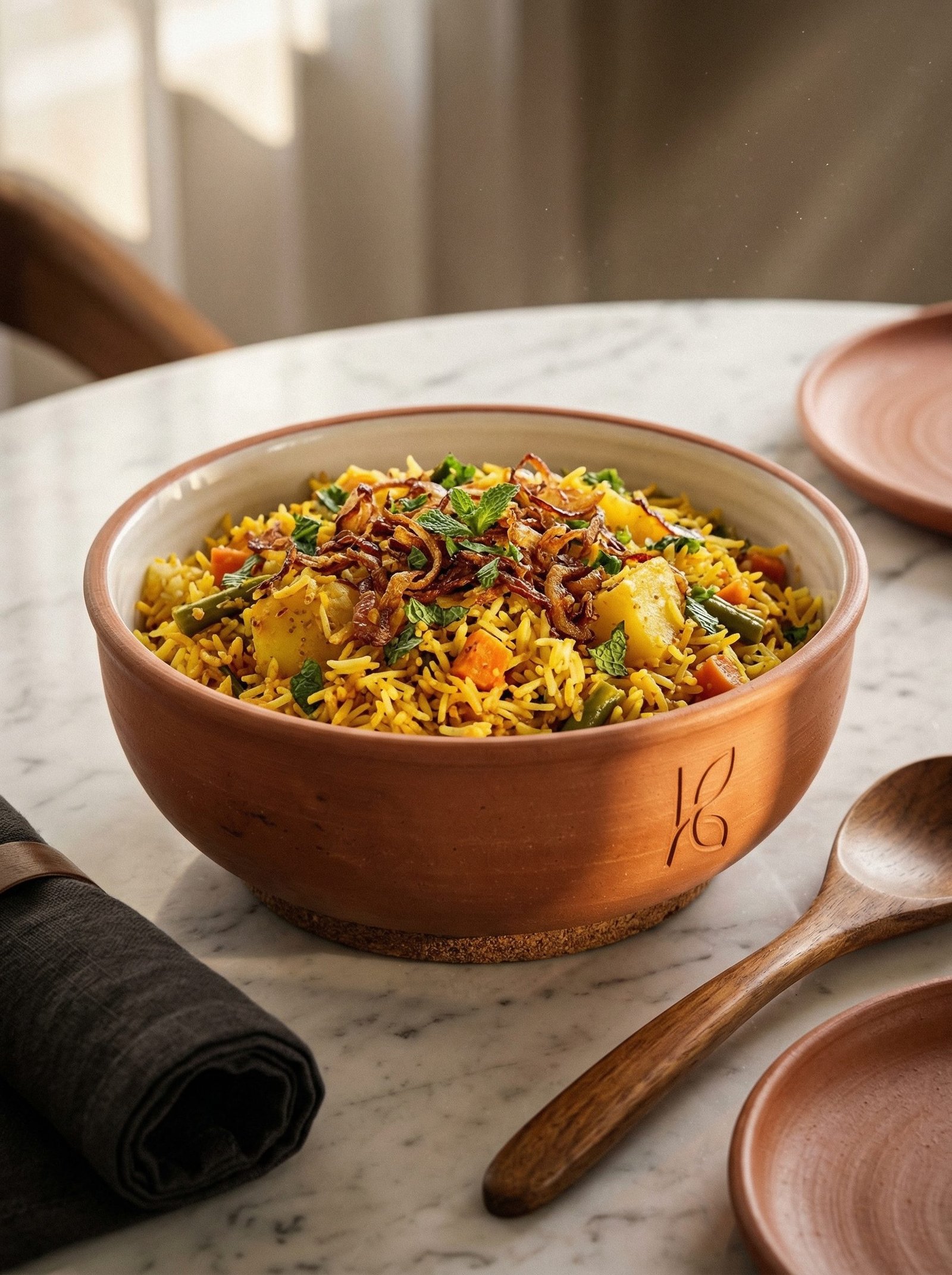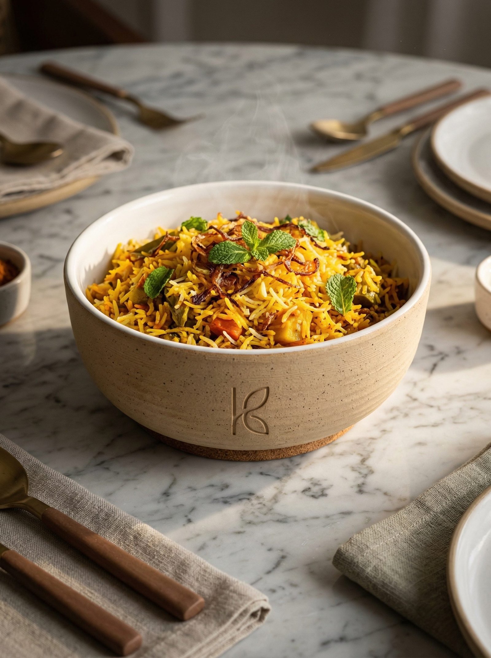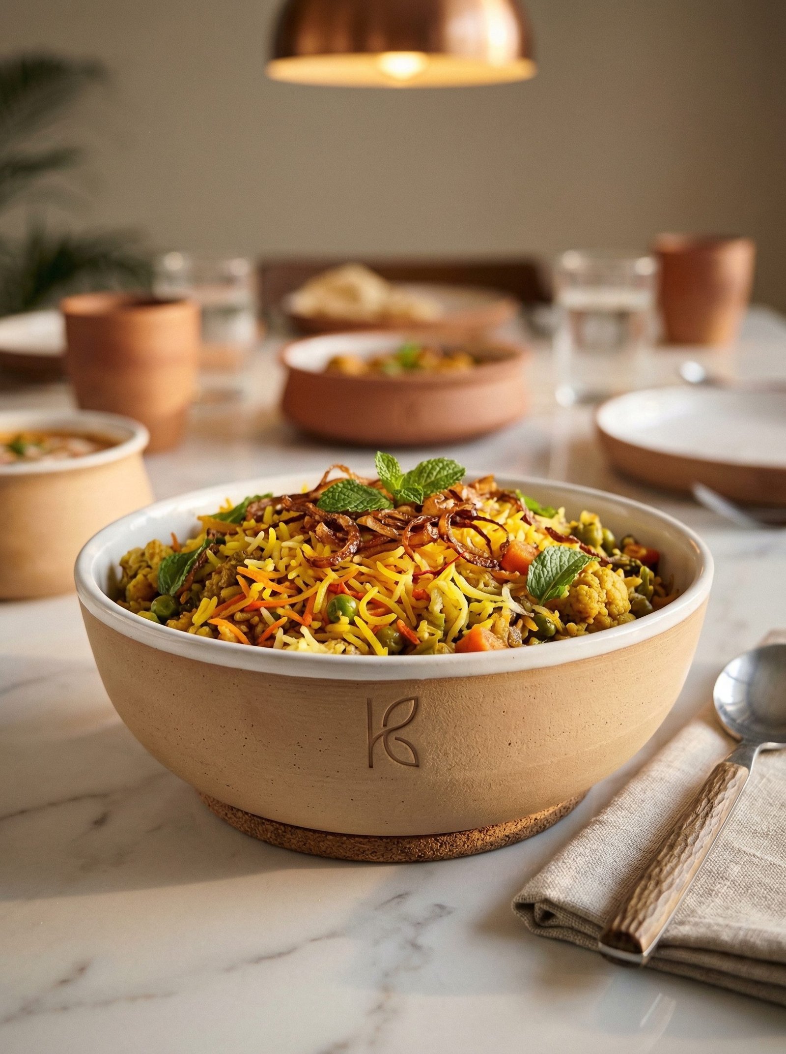 At 1L, the serving bowl is large enough to sit at the centre of the dining table as the main serving vessel, not just as a side bowl. When filled with dal makhani for four people and placed on the table, it reads as intentional — a vessel that was chosen, not inherited. The 1L bowl is also the right size for the traditional Indian serving sequence where the main dal or sabzi is placed centrally and people ladle from it into their thalis. The wide, open mouth allows easy ladling without spilling; the Bone Kaolin interior allows the food’s colour to show clearly so you can see what you are serving.