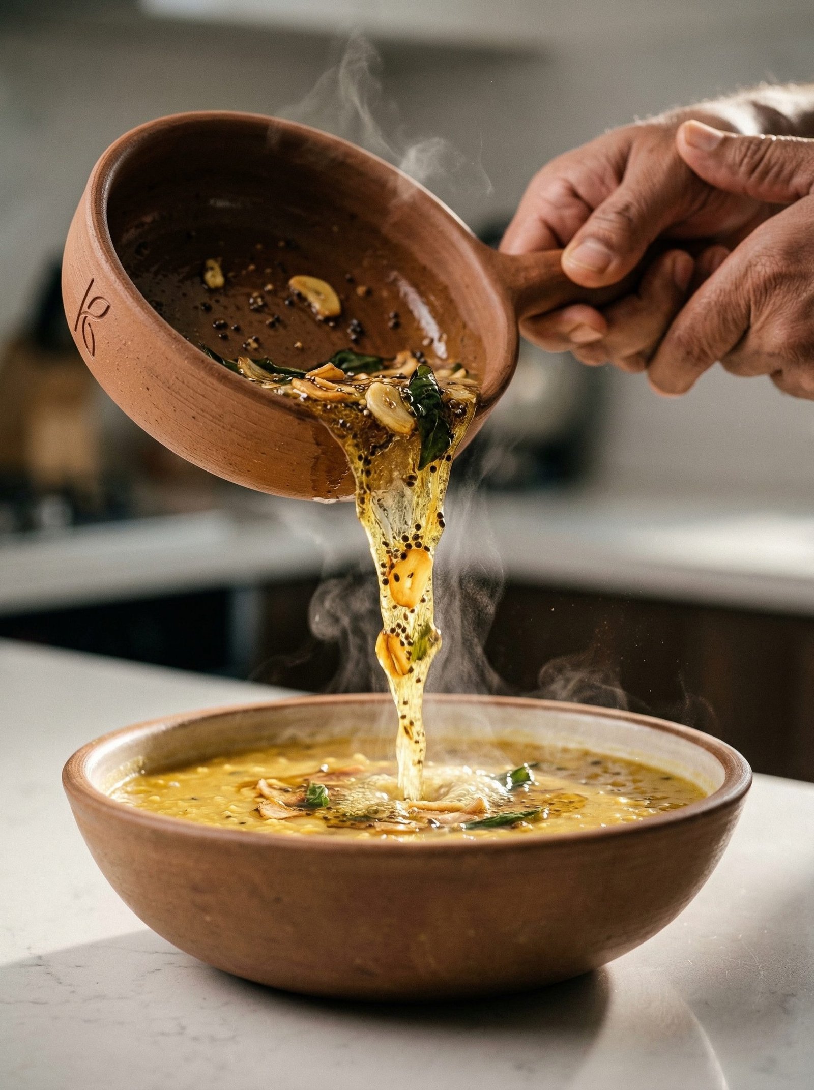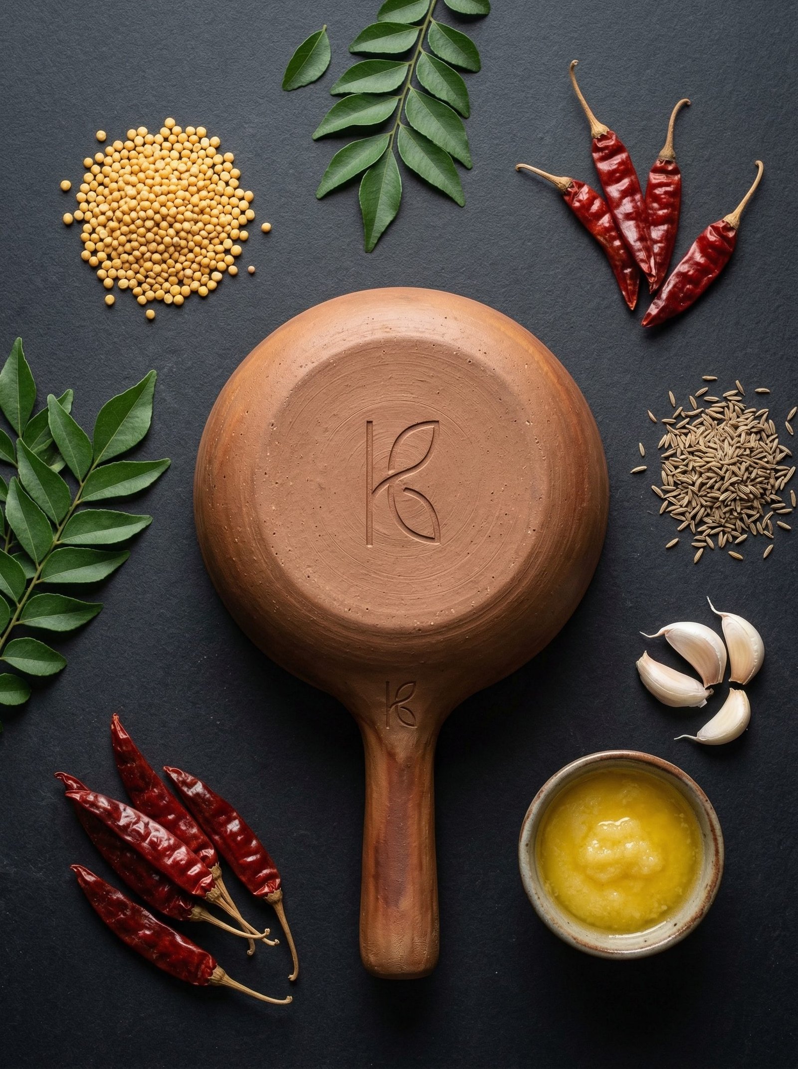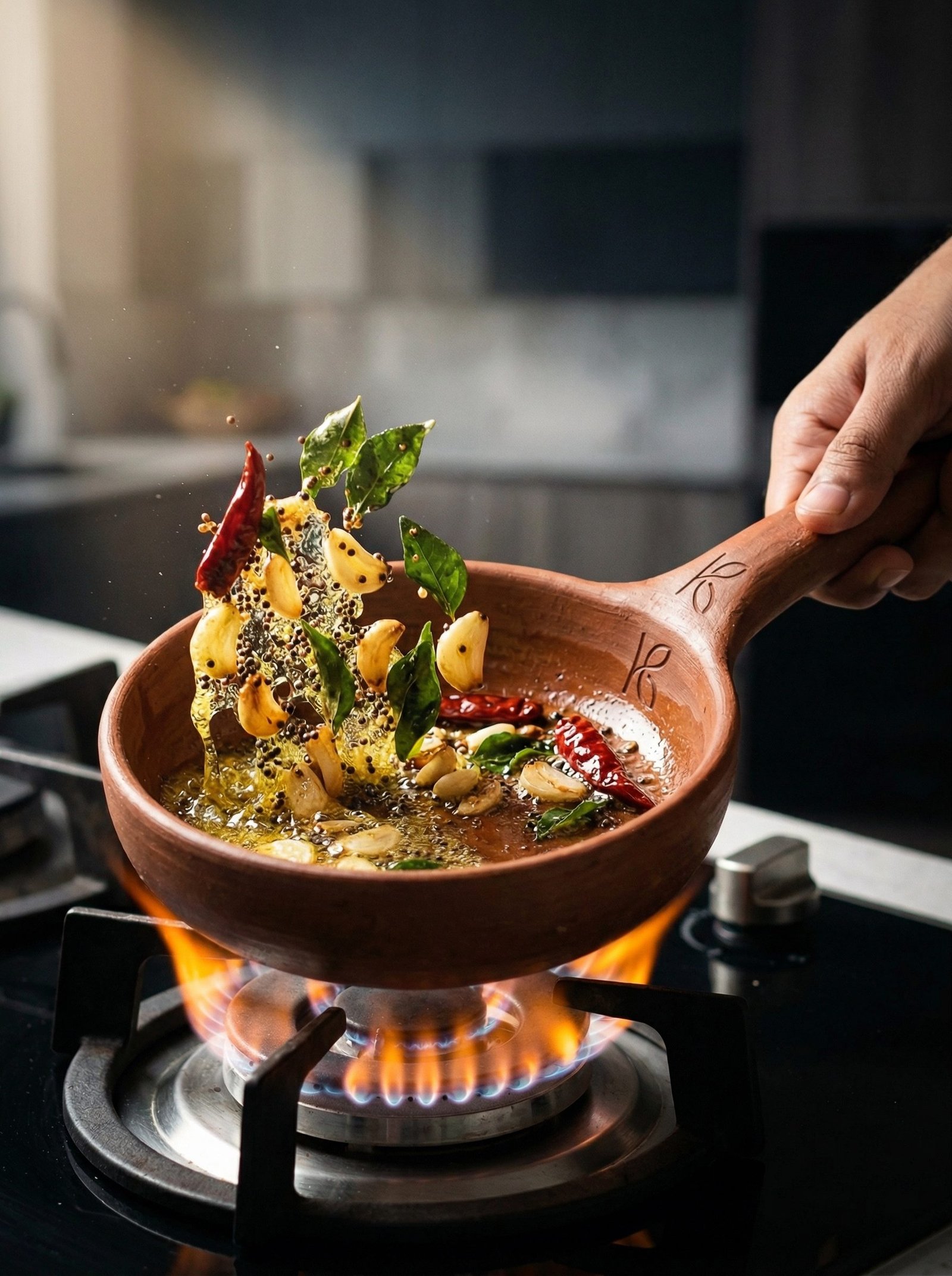 Curry leaves burn faster than mustard seeds. Add the curry leaves 10–15 seconds after the mustard seeds have already popped, not simultaneously. The clay pan’s even heat makes this timing more consistent because the temperature distribution is more uniform — the seeds pop at a predictable moment rather than at different times across the pan.