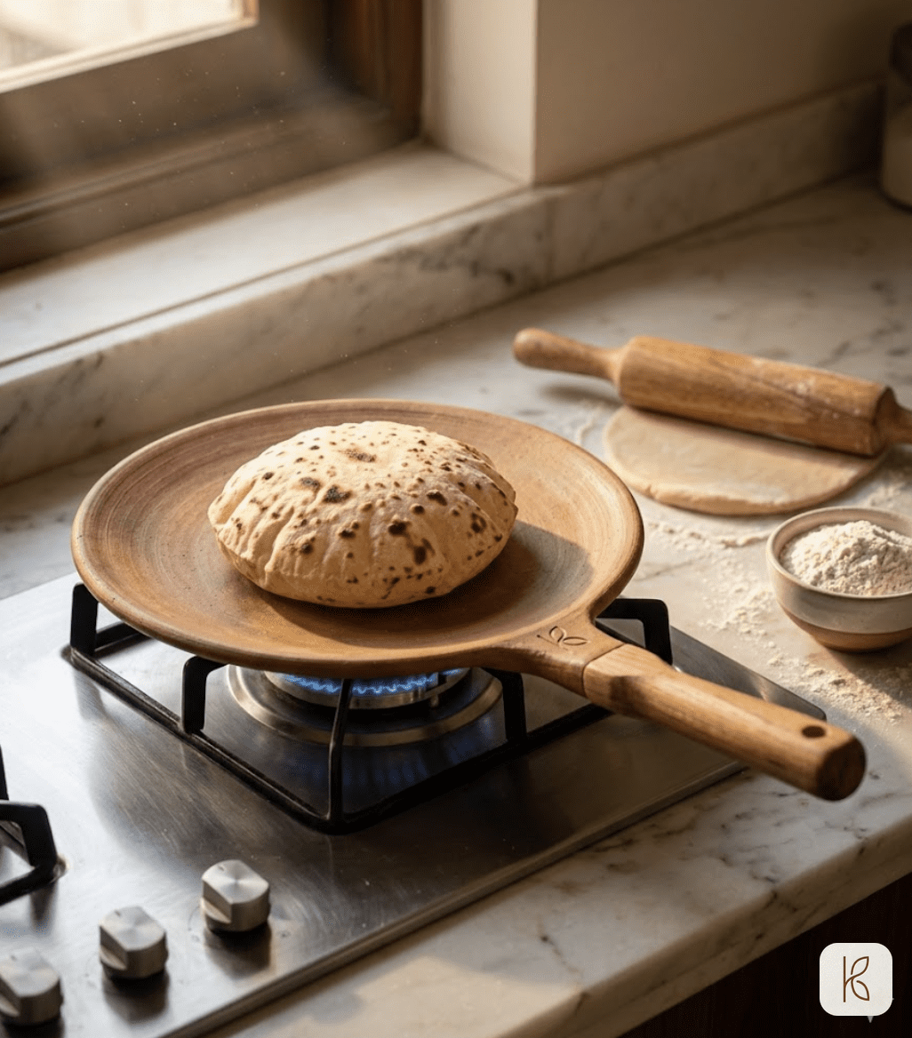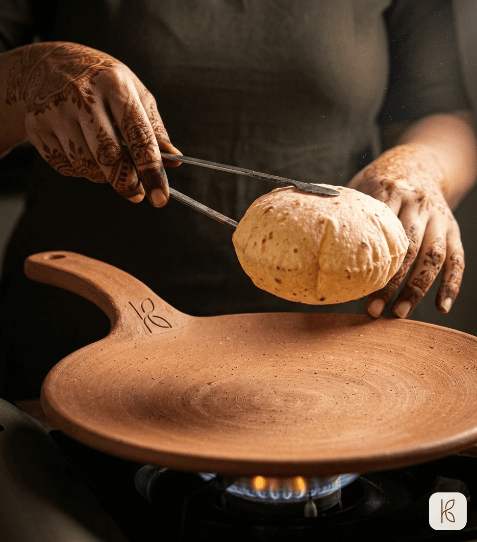 The traditional method of direct flame for puffing rotis works with clay tawa — but do it carefully. Lift the tawa by the handle, hold it 3–4 cm above the flame, rotate slightly. The clay retains enough heat from the tawa session to puff the roti quickly. Do not leave it on direct flame longer than 30 seconds.