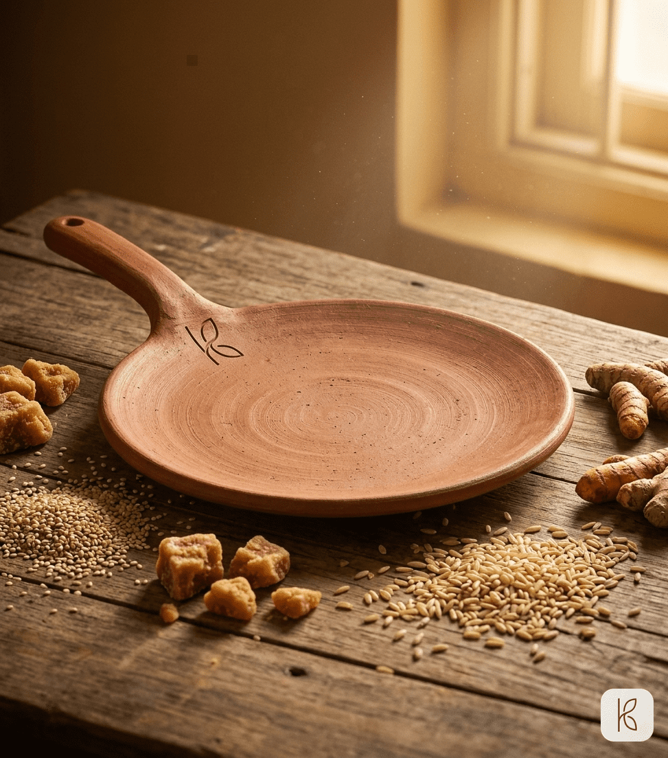 - No Fumes at High Heat: PTFE decomposes at 260°C. A dry tawa on full gas can exceed 350°C before the roti goes on. Terracotta at 350°C releases nothing — it was formed at 850°C. The chemistry is stable.
