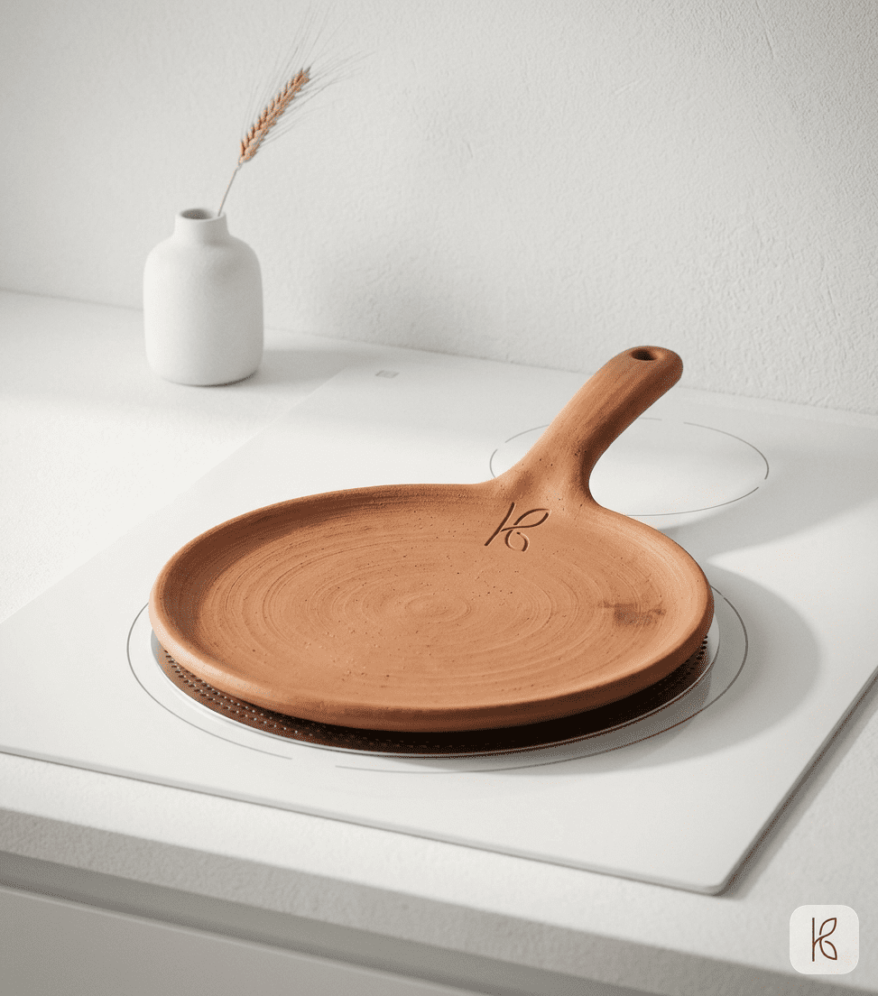 The clay tawa’s advantage over iron for roti-making comes down to temperature recovery. When you place a cold roti on a hot iron tawa, the iron’s temperature drops instantly and then recovers sharply — creating a 30-second window of uneven cooking as the iron races back to temperature. Clay’s lower thermal diffusivity means the temperature drops more gradually and recovers more gradually, giving the roti time to set evenly before the surface reheats. Fewer hot-spot burns. More consistent puffing.