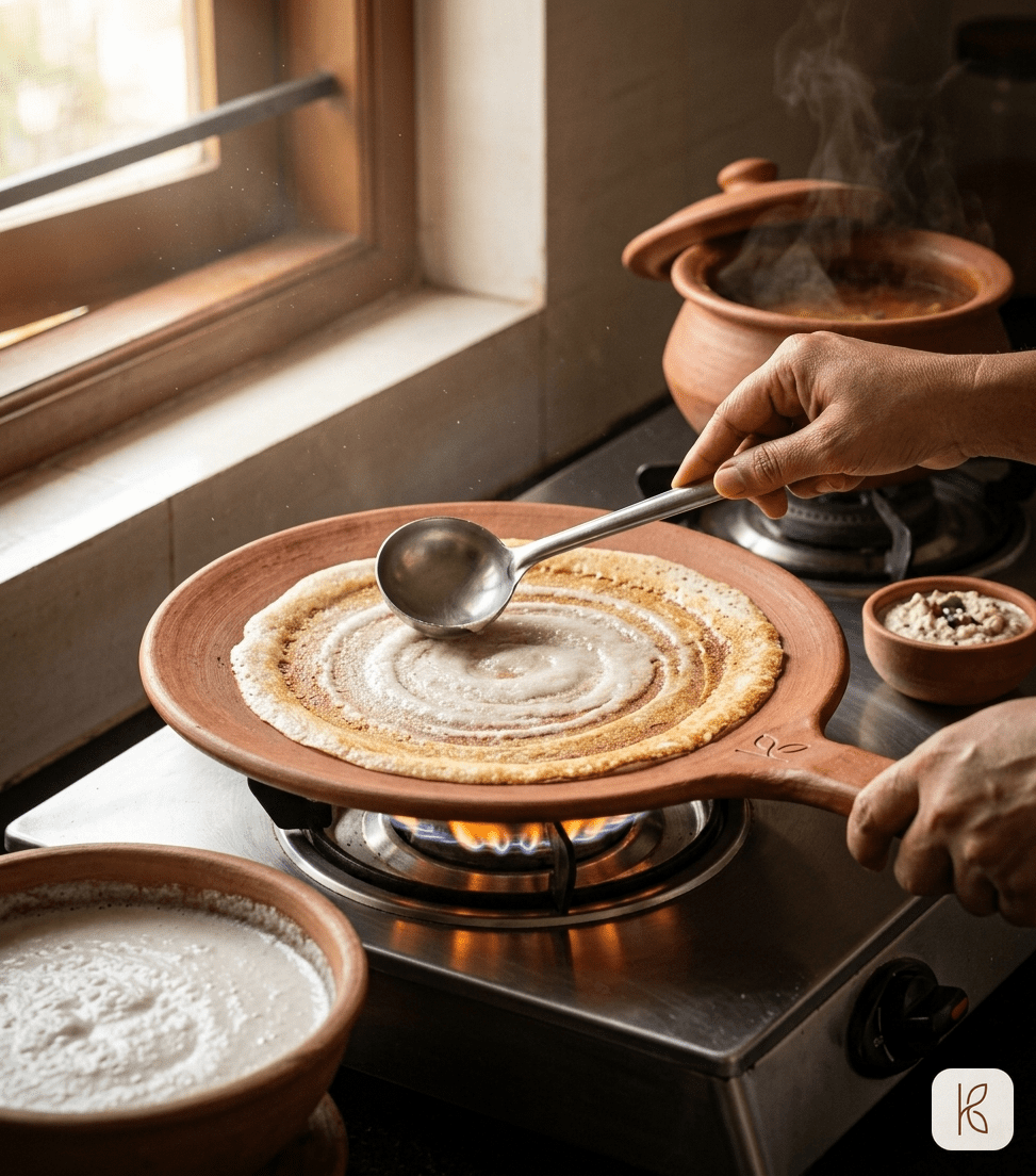 - Dosa Temperature Physics: Clay’s lower thermal diffusivity slows the temperature drop when cold batter contacts the hot surface. The batter has more time to spread evenly before the clay reheats — fewer burns, more even crepes.