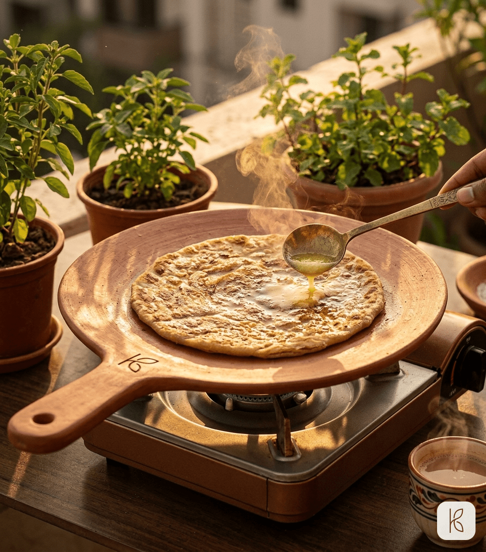 The 12-inch tawa is the most requested size in our range from South Indian households. The clay surface for dosa-making is particularly effective because dosa batter — which is rice and lentil-based, at a slightly acidic pH — benefits from the clay’s alkaline surface interaction. The slight pH buffering produced by the clay contact produces a crisper edge and a more evenly browned surface than an iron tawa, which is reactive with the acidic batter over extended use.