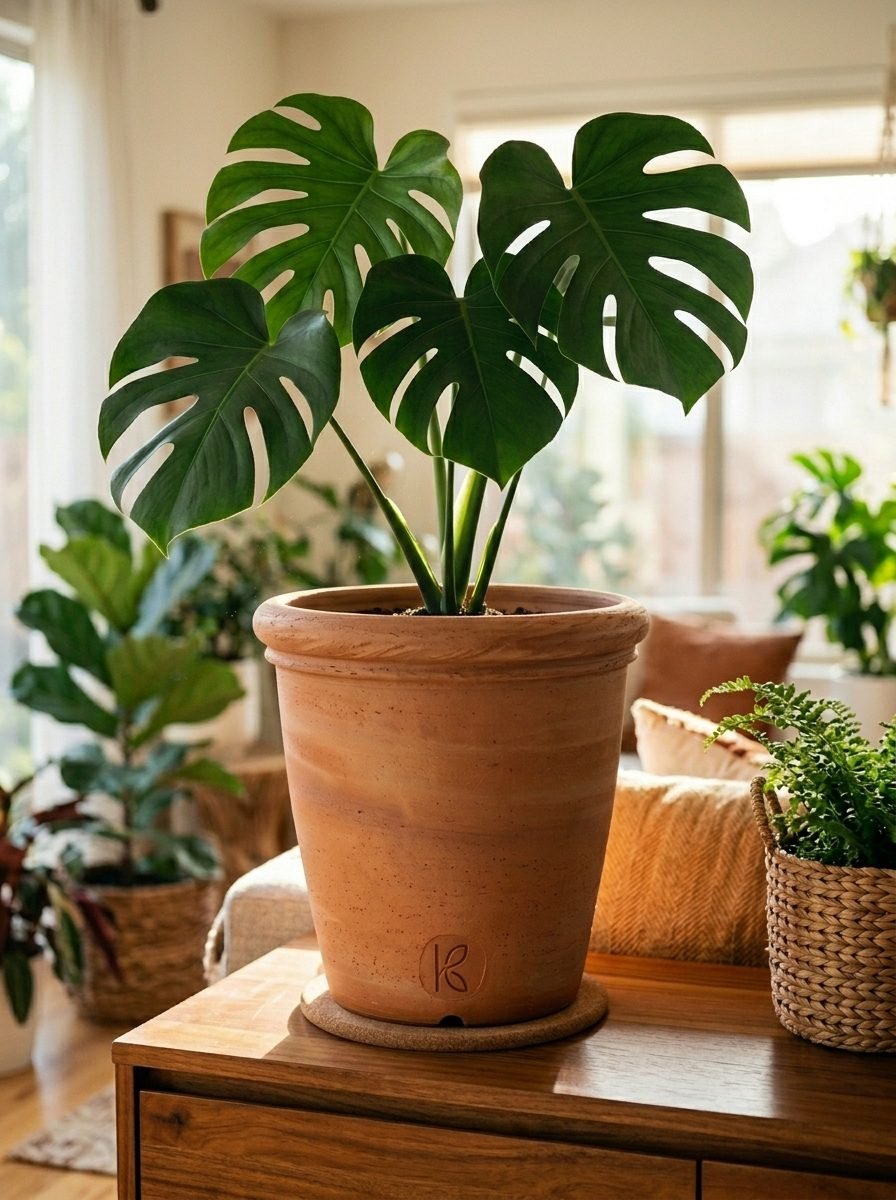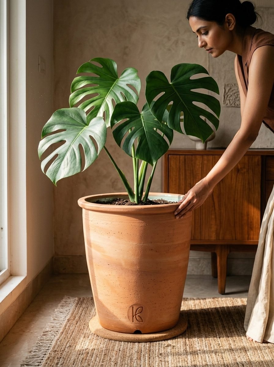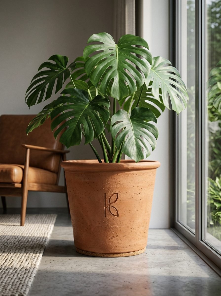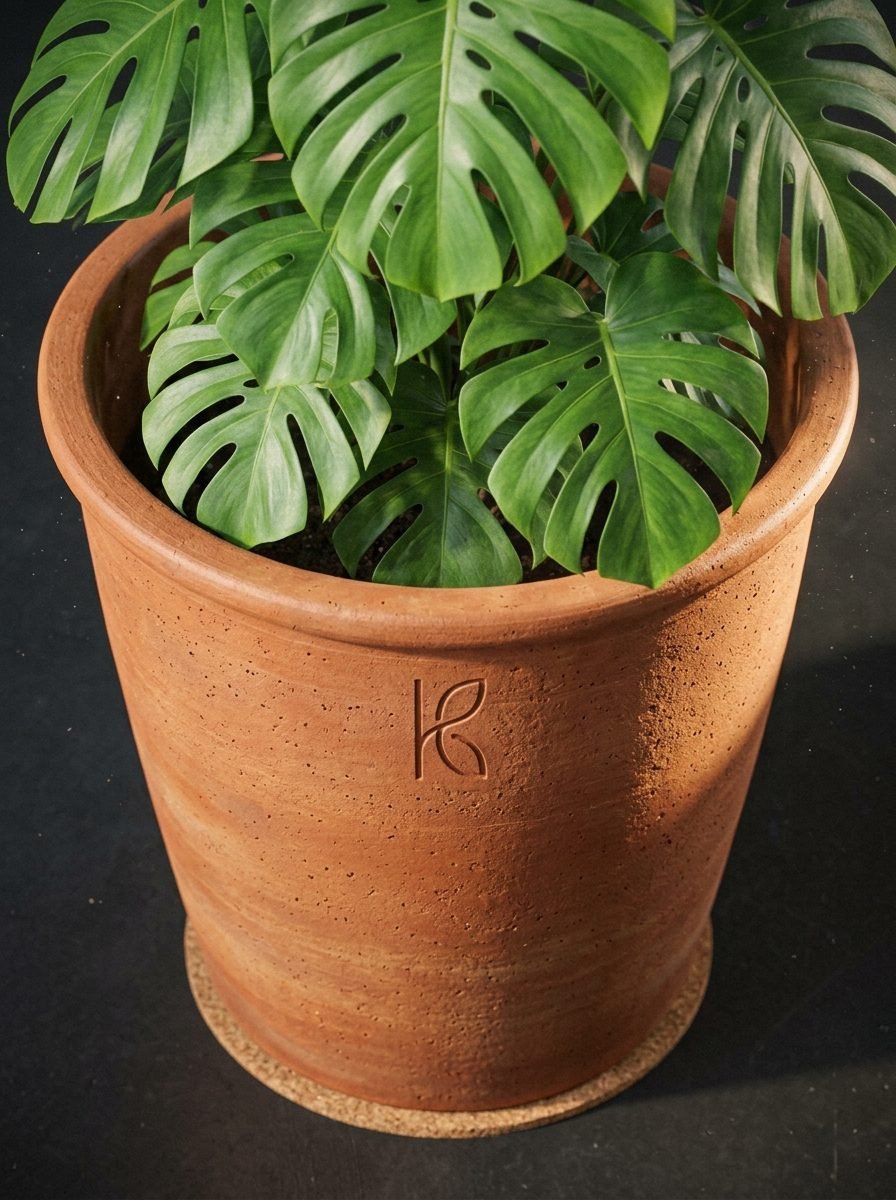 - Statement Scale: At 25cm, the clay body has enough visual mass to be a room element in its own right. The warm terracotta of a 25cm base against a light floor — with a monstera or rubber tree above it — is the complete composition.