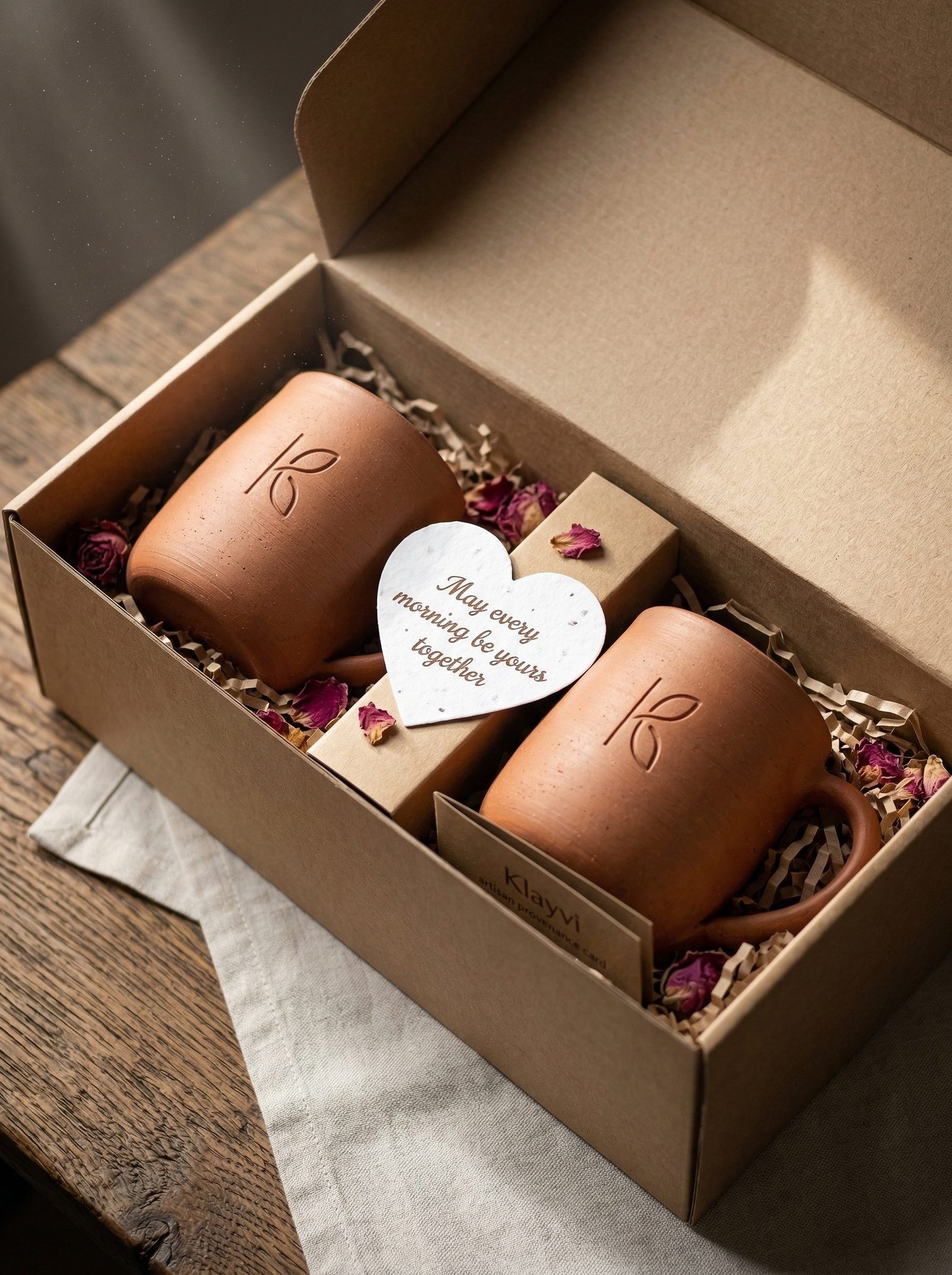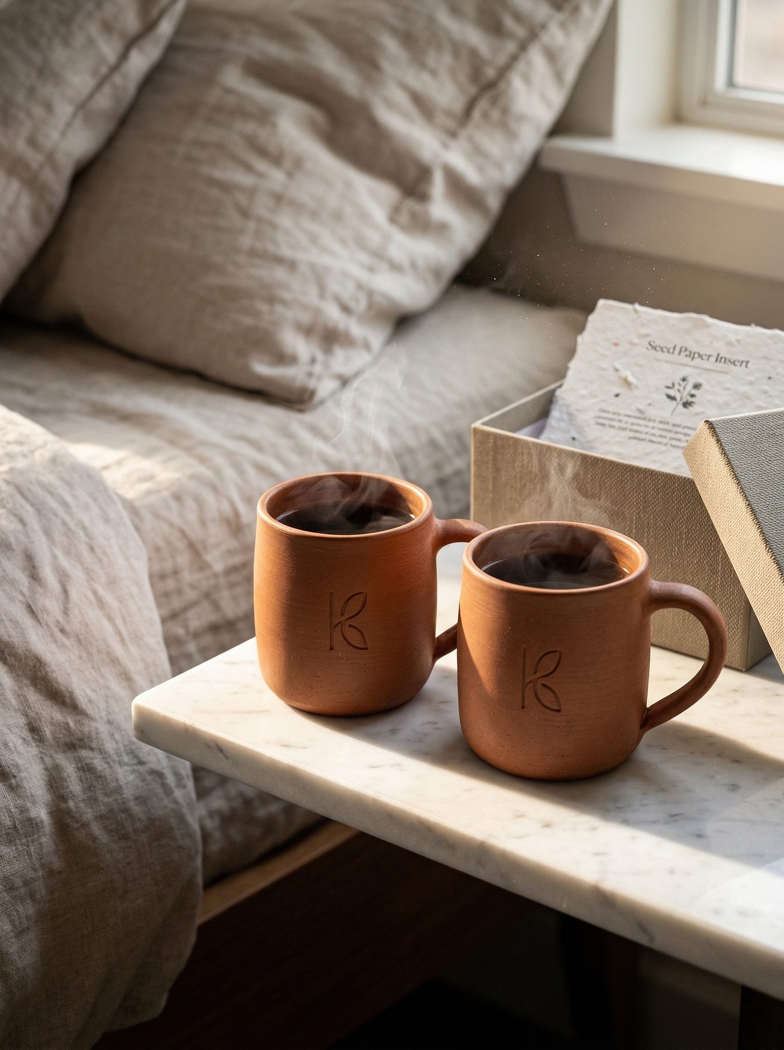 - Premium Gift Box: Kraft box with bamboo pull-tab. Inside: each mug in natural cotton muslin. Seed paper insert — plant it, it grows wildflowers. The box is a keepsake that people use after the mugs are in the cupboard.