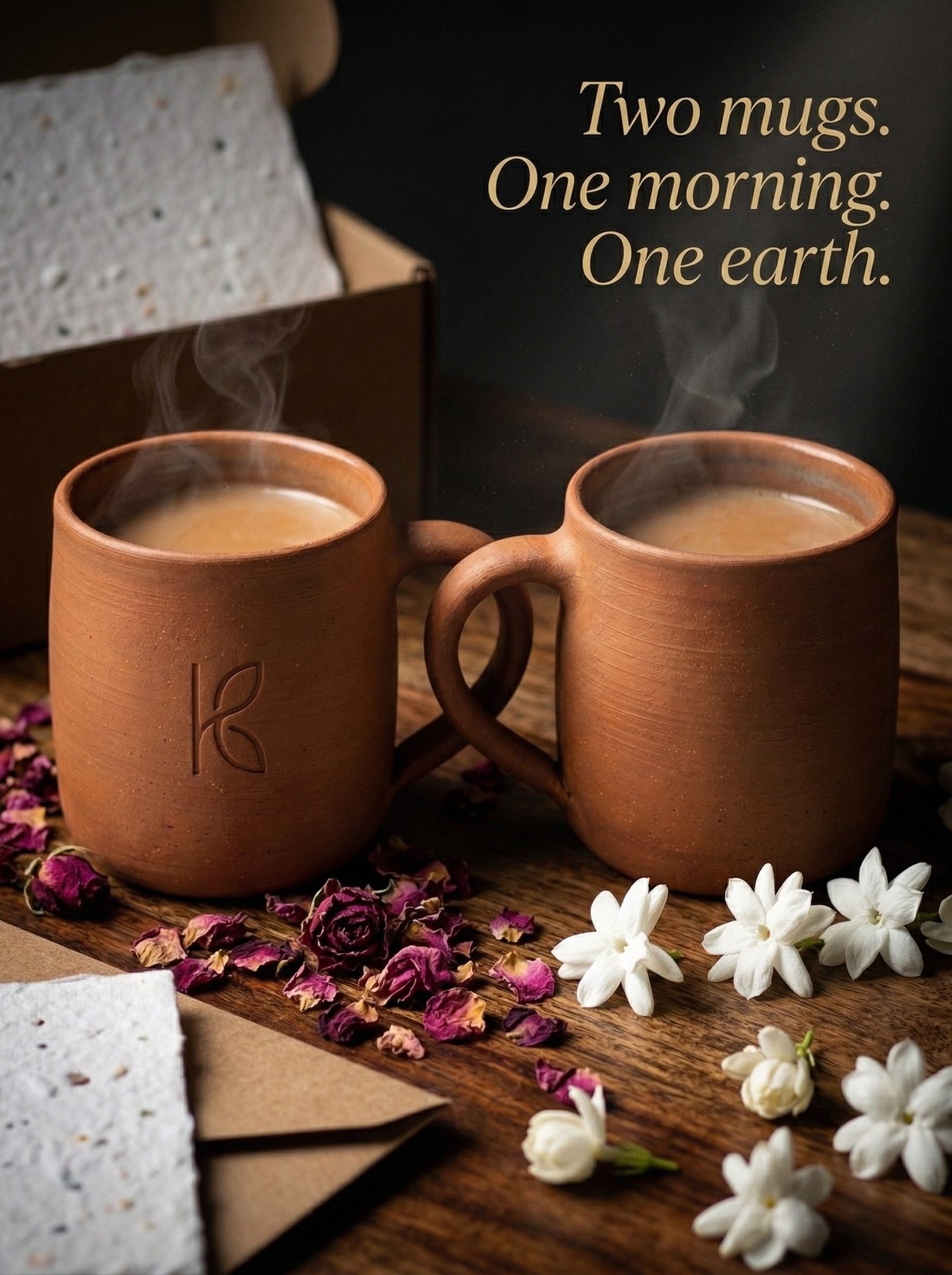 Two 300ml clay mugs, matched from the same batch for visual consistency, each showing the slight natural variation that confirms hand-throwing. Premium kraft gift box with seed paper insert. The most-purchased gifting SKU in our drinkware range — for housewarmings, anniversaries, or any morning that deserves better than what a ceramic factory produces.