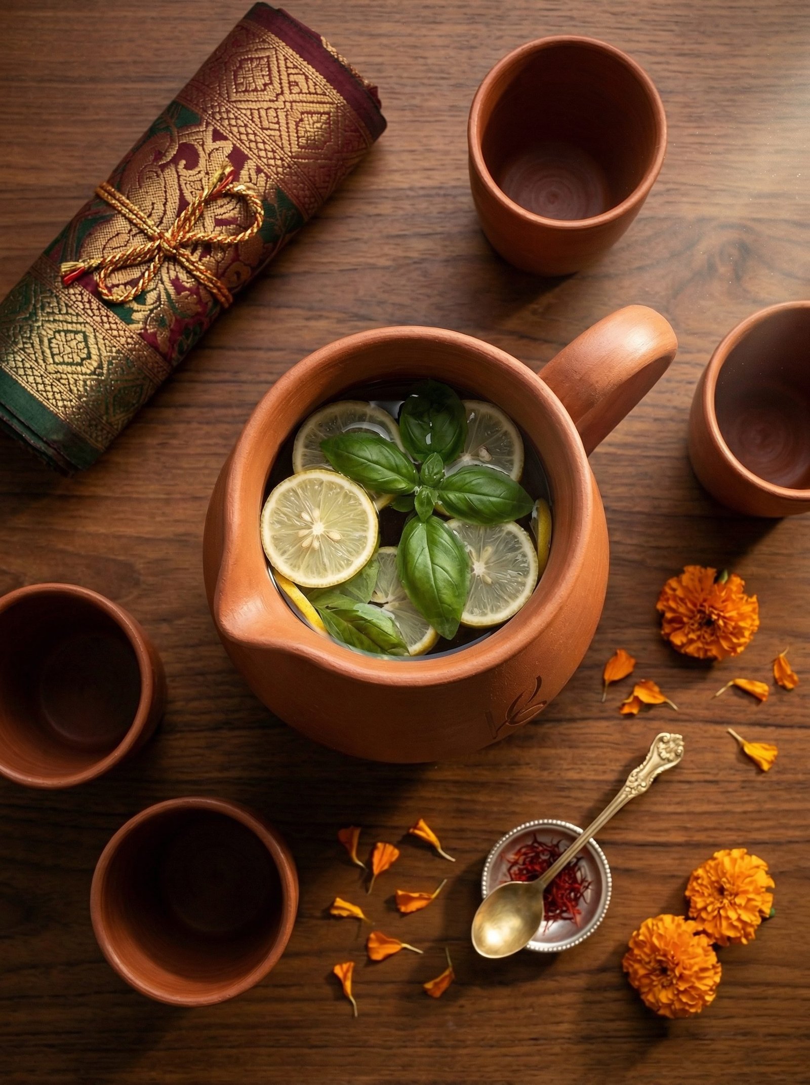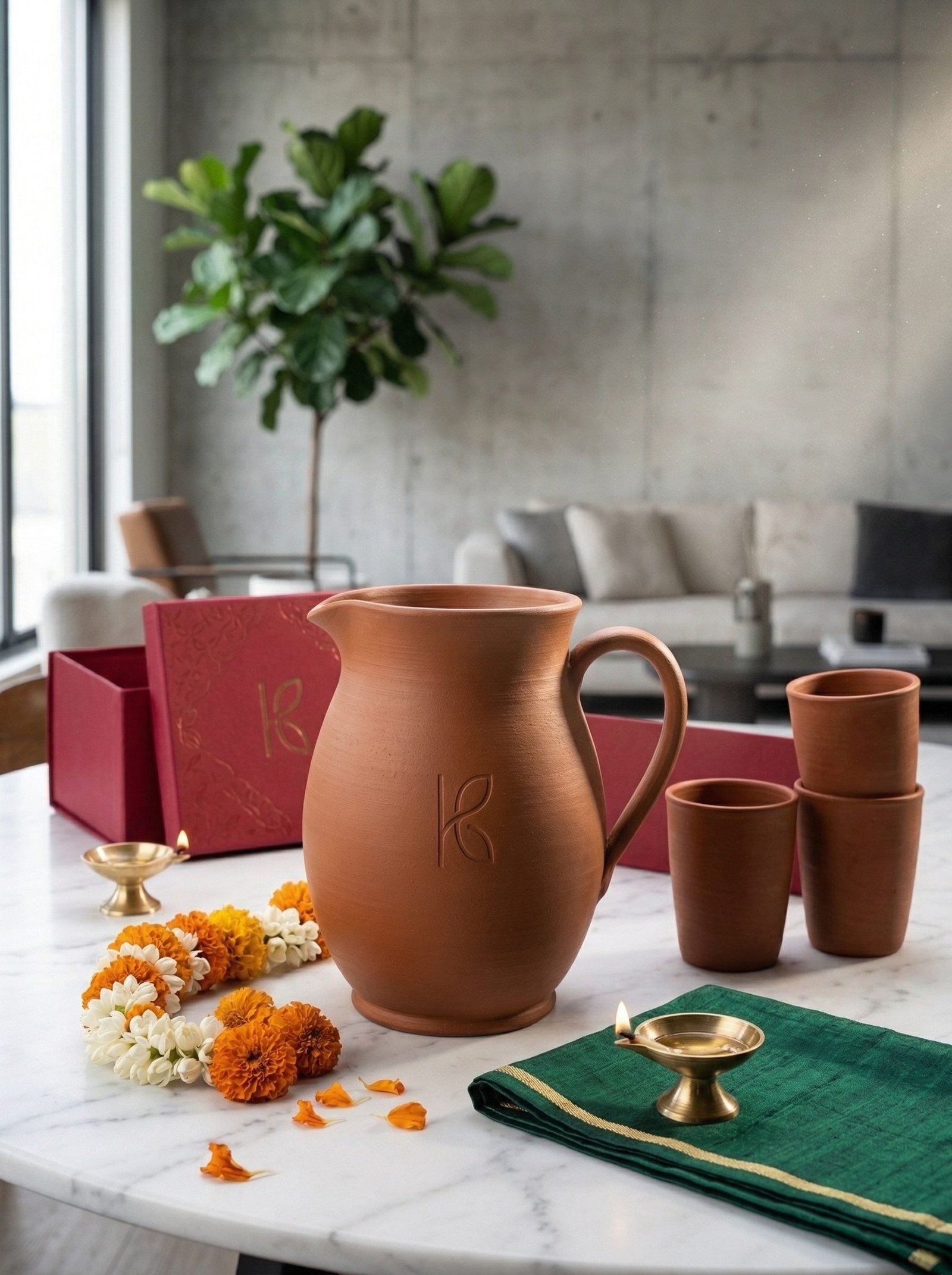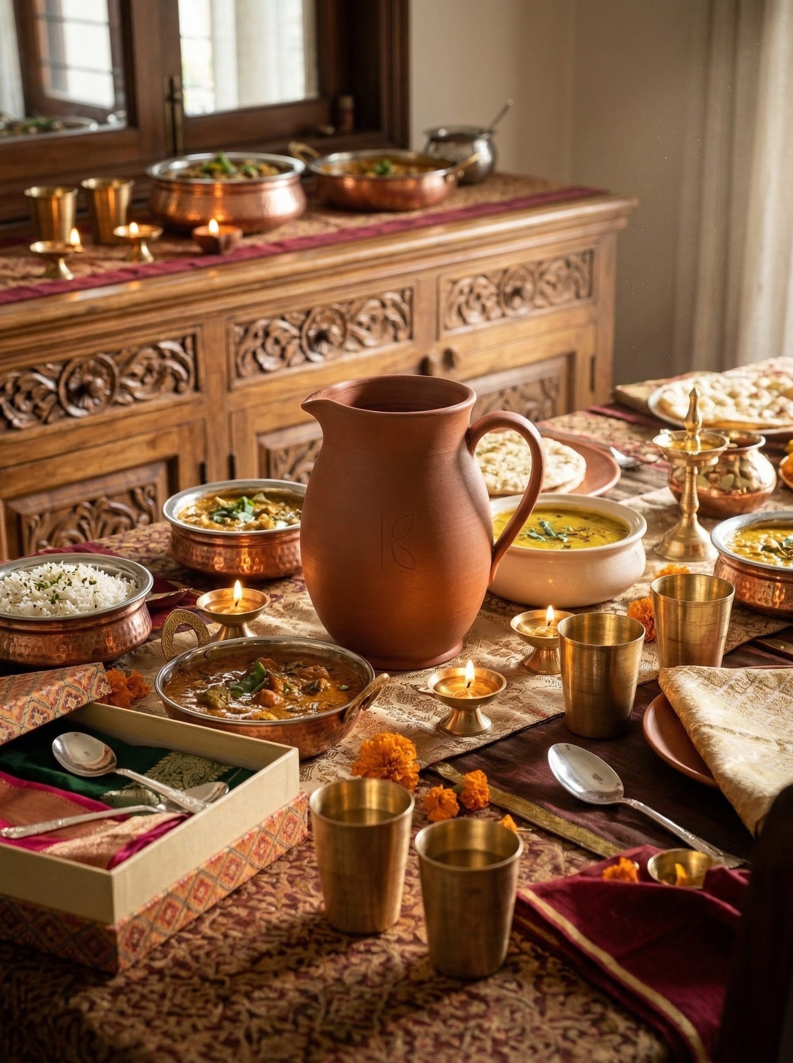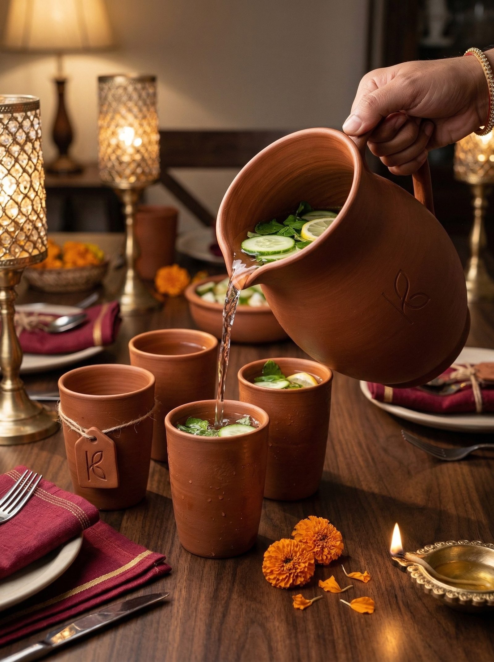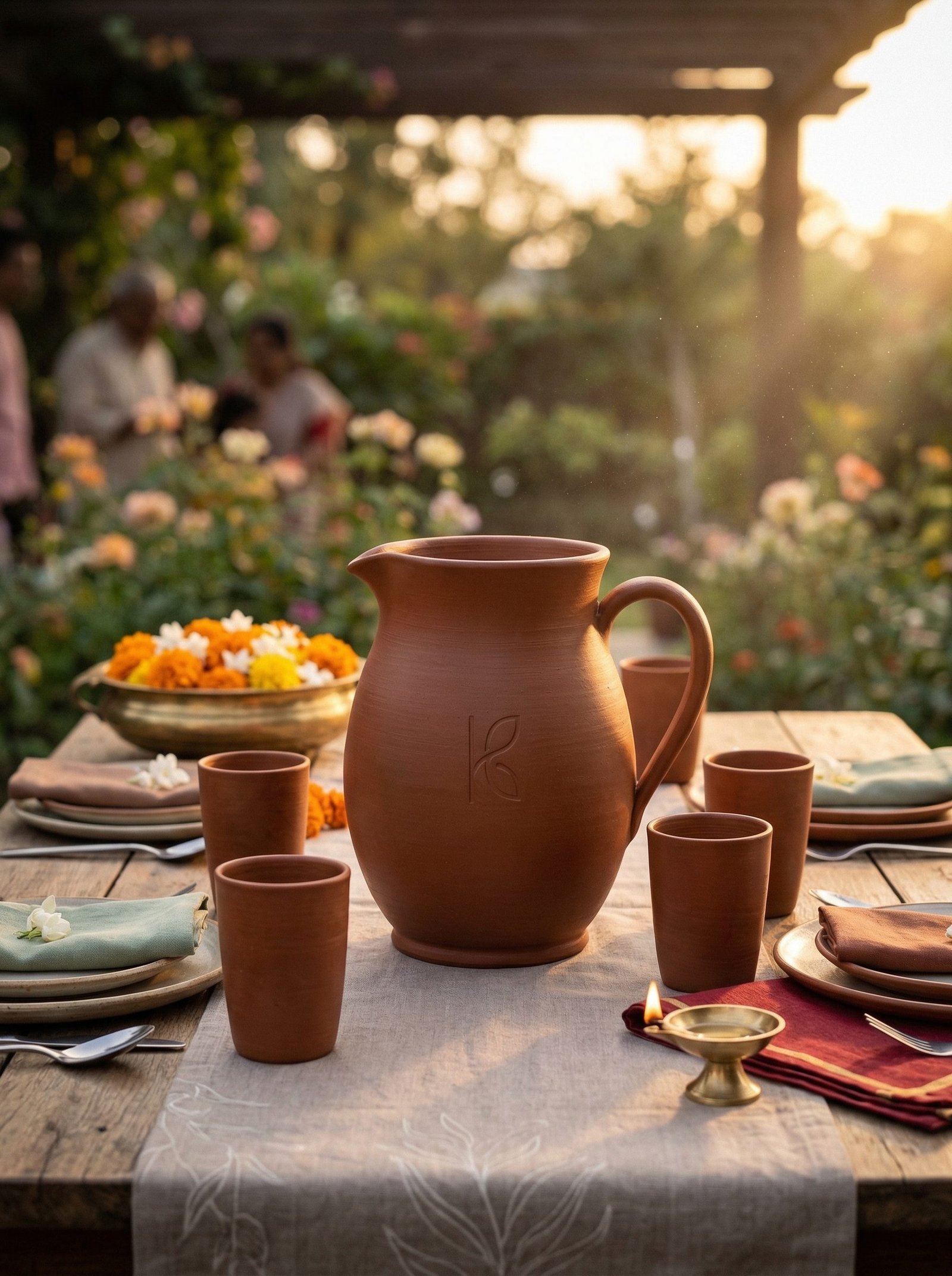 The presentation of water at the dining table affects hydration behaviour. Studies in public health nutrition have found that households with accessible, visible water vessels on the dining table drink measurably more water during meals than households who fetch water from the kitchen. A beautiful clay jug on the table is not just aesthetics — it is hydration infrastructure.