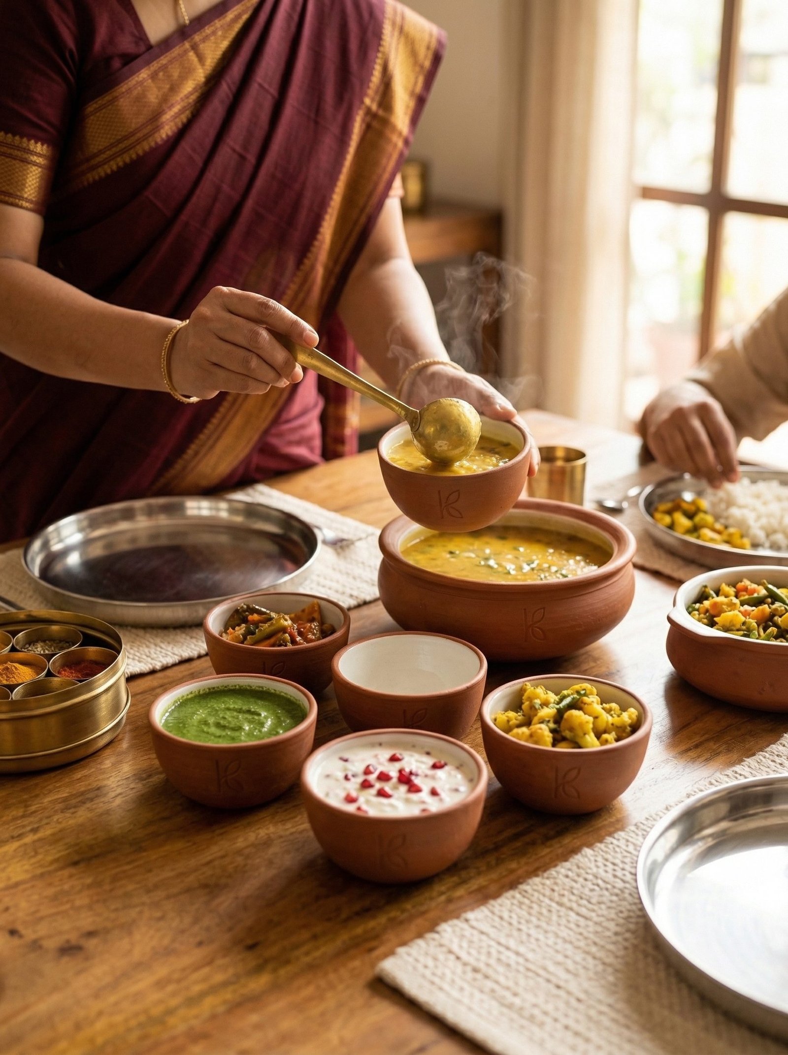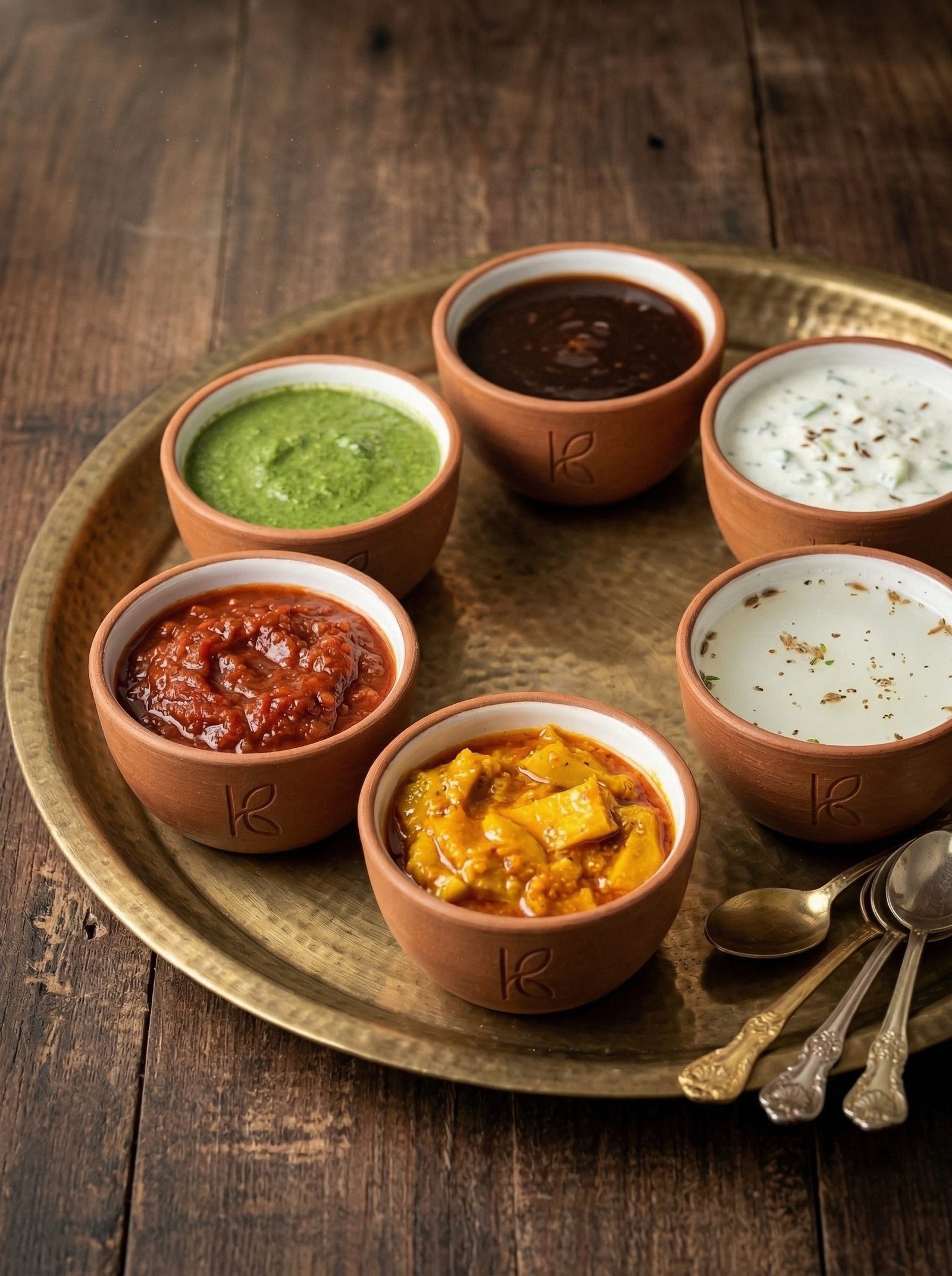 The condiment arrangement on an Indian thali is not random. The Ayurvedic six-taste (shad rasa) system — sweet, salty, sour, bitter, pungent, astringent — is systematically activated by the condiments arranged around the thali. The katoris are the vessels of this system. Clay katoris that maintain condiments at the correct serving temperature (slightly below ambient for fresh chutneys and raita; warm for cooked dal) deliver each rasa more effectively than containers that allow the condiment to reach room temperature rapidly.