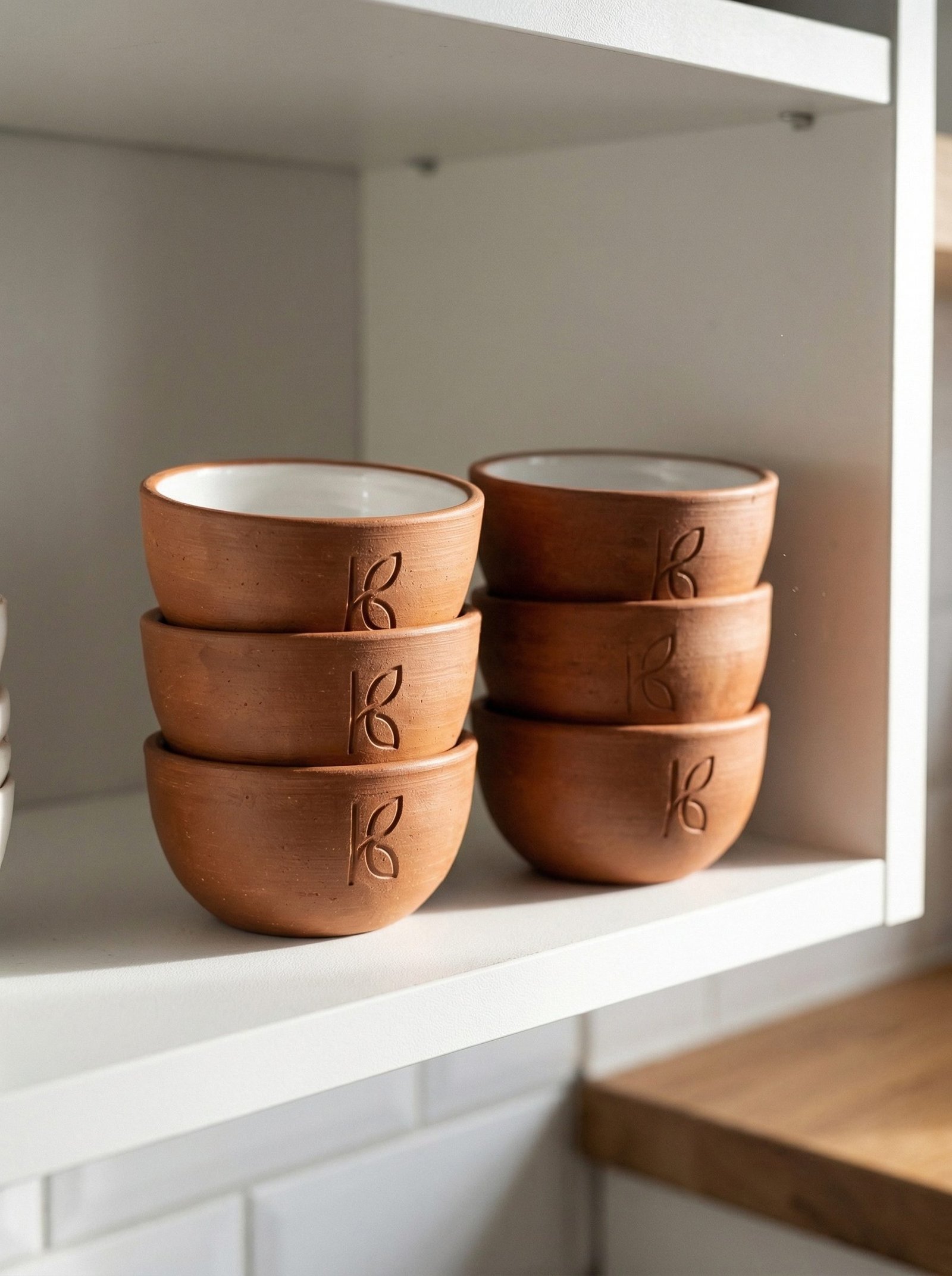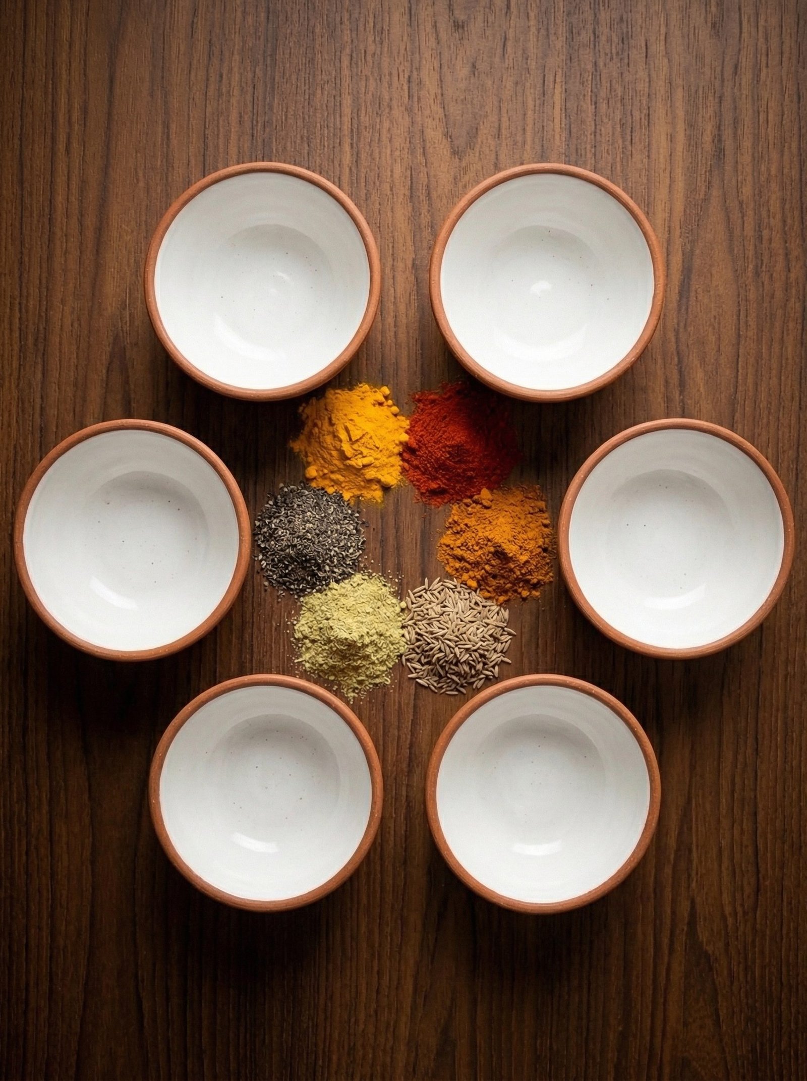 Six small round serving bowls, 150ml each, with smooth Bone Kaolin interior glaze, natural terracotta exterior, and anti-topple cork base ring on each bowl. XRF-certified as a set. The complete Indian table condiment service: dal, chutney, raita, pickle, papad accompaniment, and anything else that belongs in a small bowl. Heat retention. Visual vibrancy. The clay table service that starts with these six.