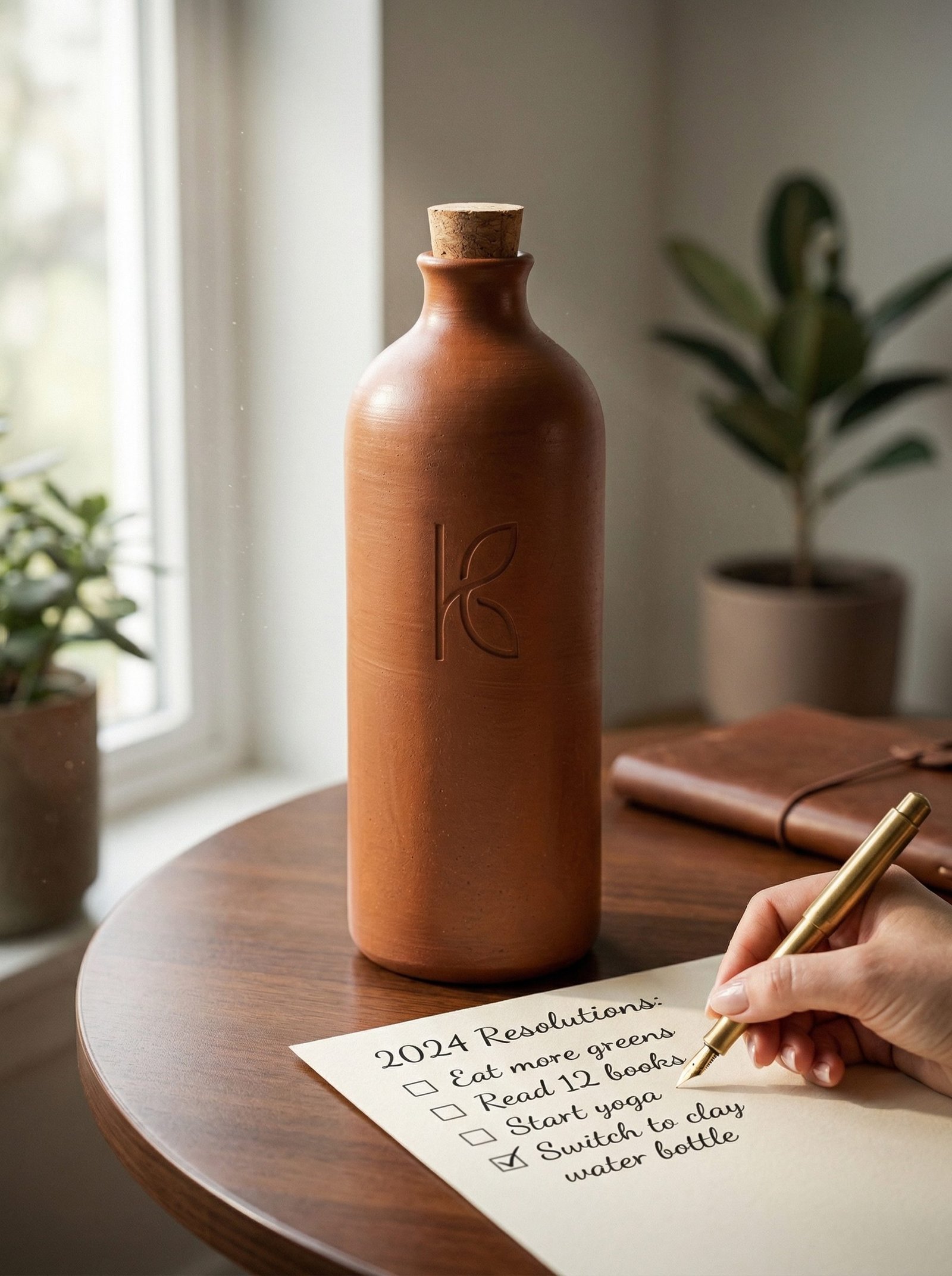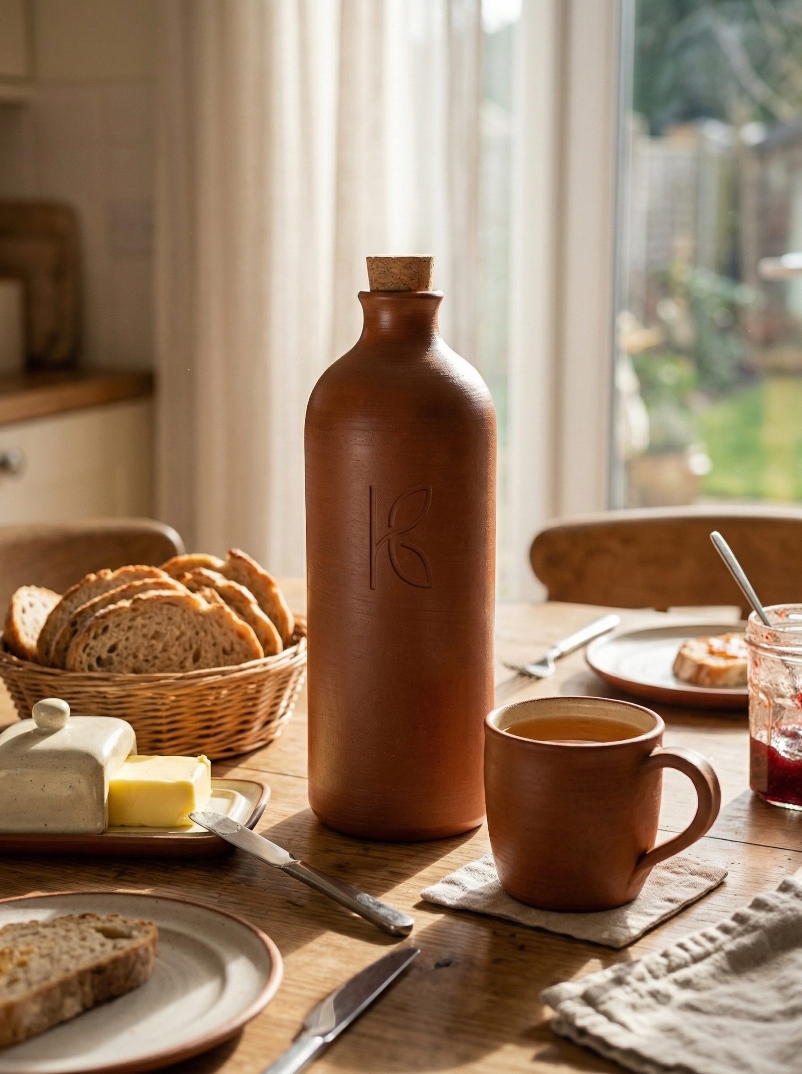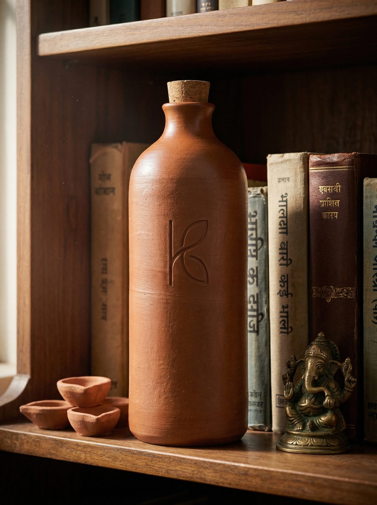 The linseed oil exterior treatment on the 1L is specific to this size for one practical reason: a 1L bottle sits on a desk for 8 hours a day. The natural evaporative moisture on the exterior of an untreated clay bottle forms a damp ring on the desk surface over 8 hours. The linseed oil treatment eliminates this by partially sealing the exterior pores — reducing but not eliminating the evaporative moisture to a level that does not mark surfaces. The treatment deepens the clay colour slightly — the 1L will appear fractionally darker than the same terracotta clay in an untreated 500ml bottle. This is the linseed oil polymerised into the surface.