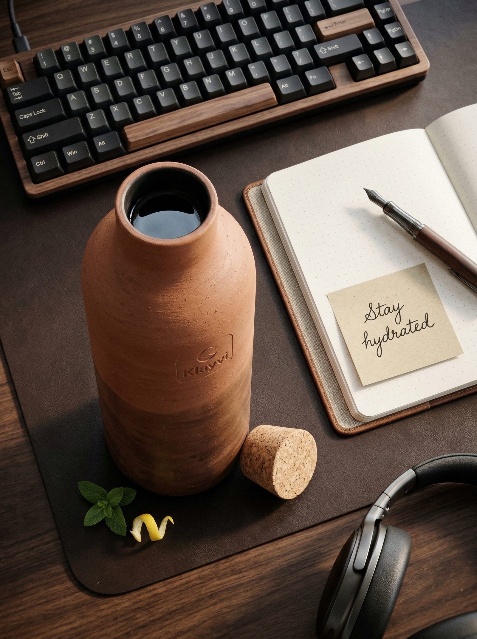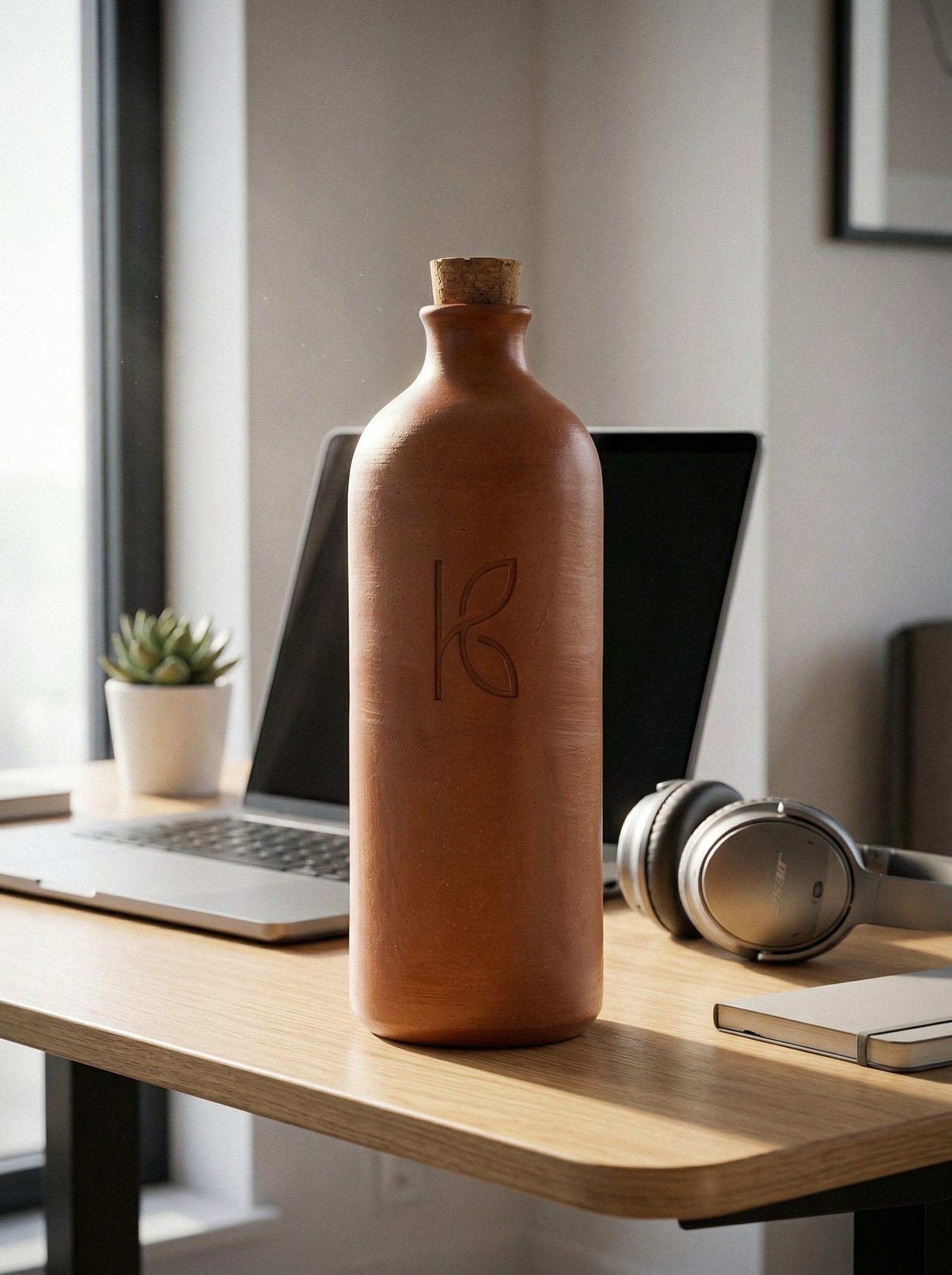 Designed for the desk. The 1L clay water bottle has a wider base than the 500ml and 750ml, deliberately weighted for stability on flat surfaces. Anti-topple cork base ring. Aqua-Lock interior. Linseed-oil exterior treatment protects the clay surface while preserving porosity and the evaporative cooling mechanism. XRF-certified. The full-day office bottle that does not shed microplastics into what you drink.