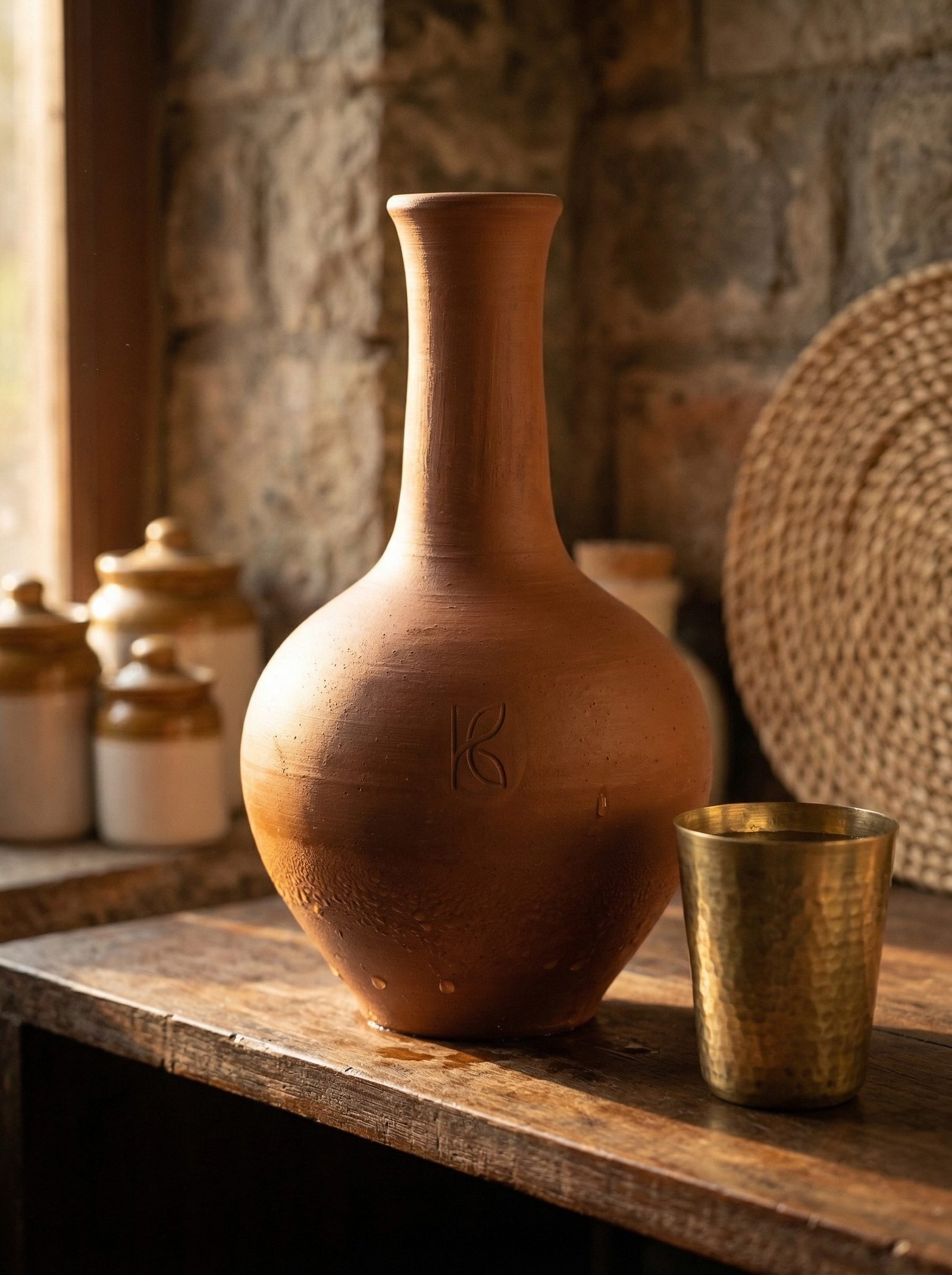 - Maximum Cooling of Any Vessel: The surahi’s belly-to-volume ratio is higher than any other vessel form in our range. More clay surface area per litre = more evaporation surface = more cooling. In dry heat, surahi water reaches 26–28°C in a 38°C room — the optimal temperature for maximum gastric absorption.