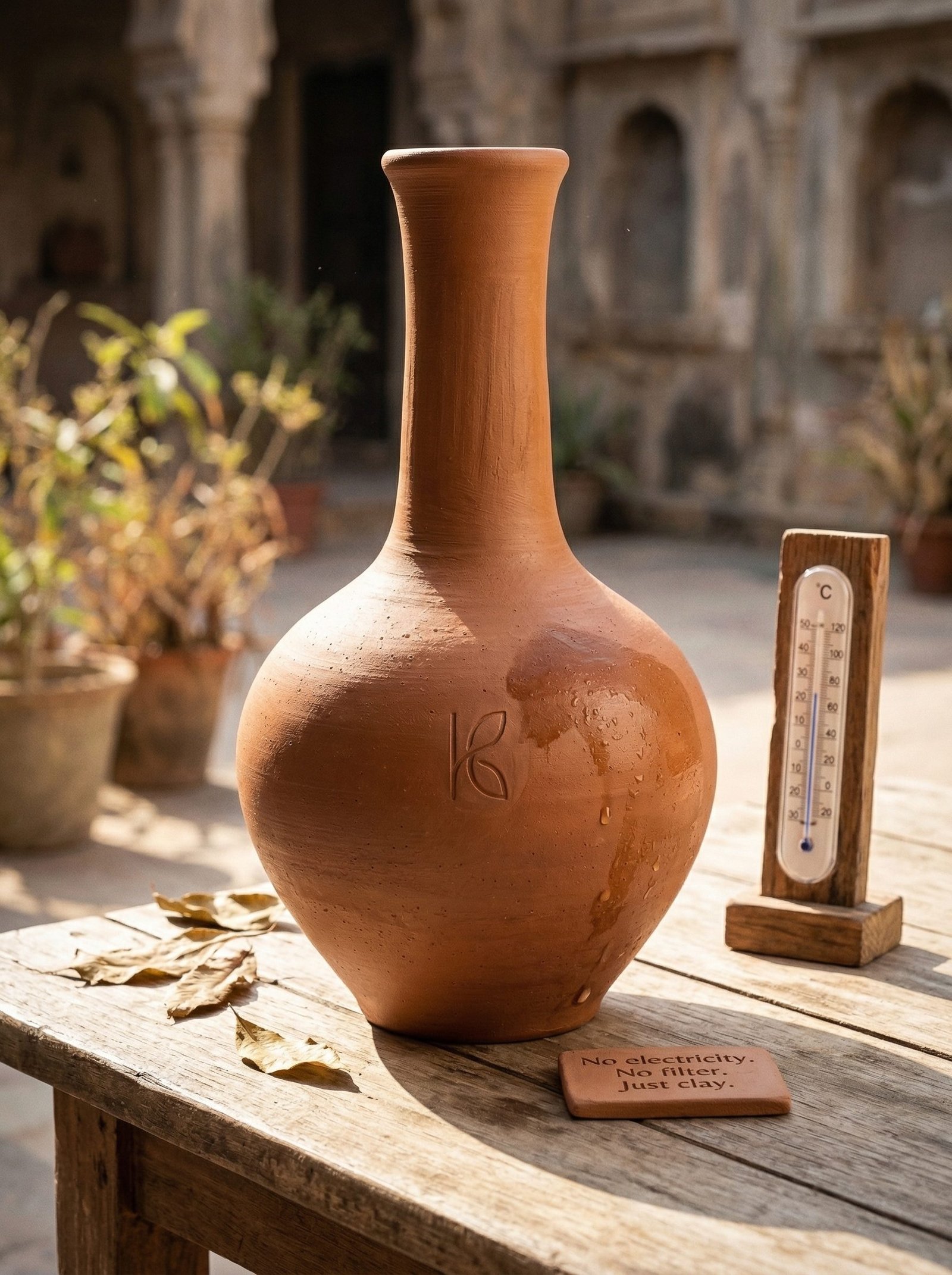 - 4,000-Year Optimised Design: The narrow neck minimises dust entry and slows water loss. The round belly maximises clay surface area relative to water volume, maximising evaporative cooling rate. The geometry is the result of 4,000 years of optimisation, not aesthetic preference.