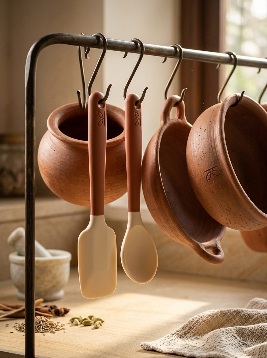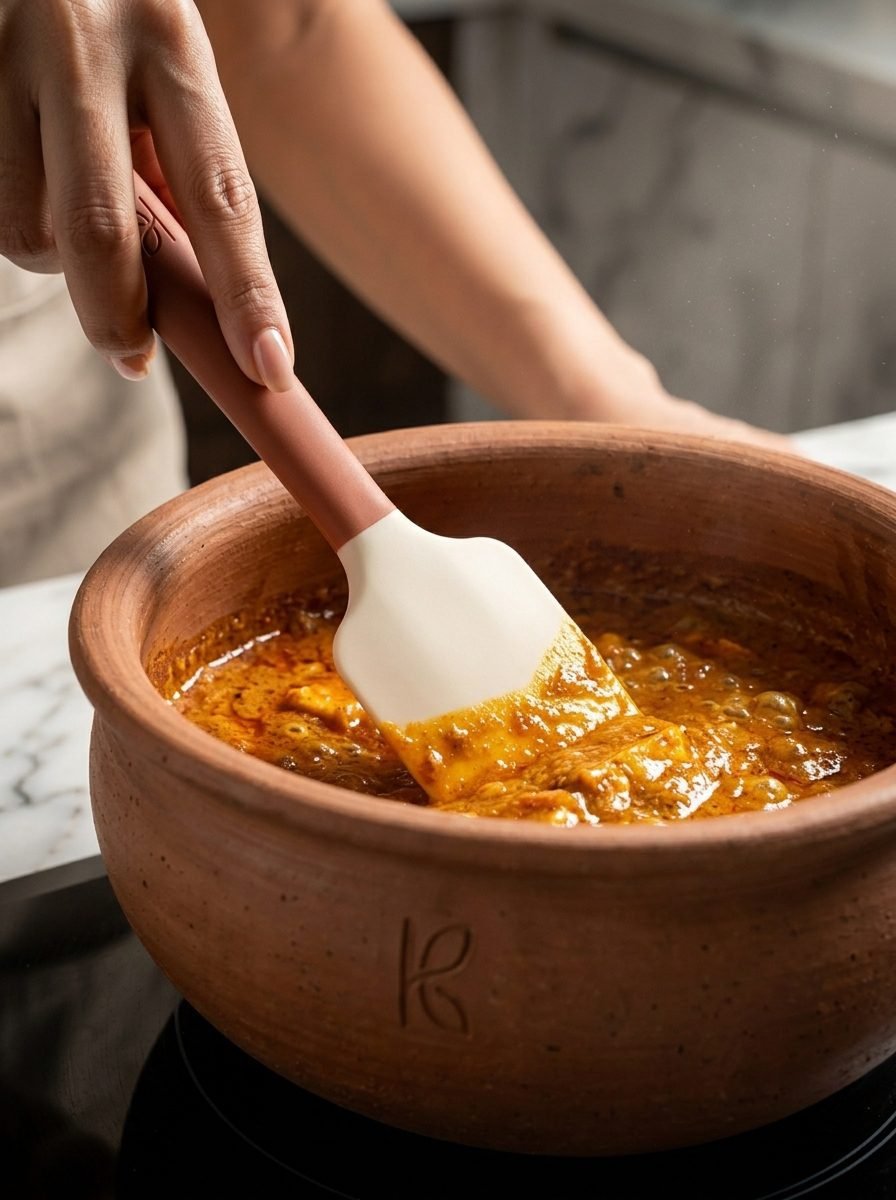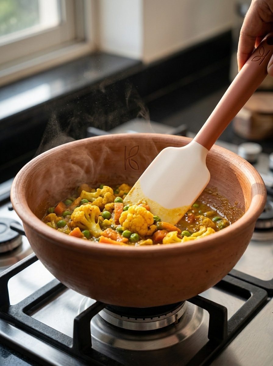 • 230°C Heat Rating: Rated for 230°C continuous contact — appropriate for the full range of Indian cooking temperatures in clay. For tadka at 280–320°C, remove the spatula from the vessel before adding ghee and spices. Reintroduce after the initial high-heat moment.