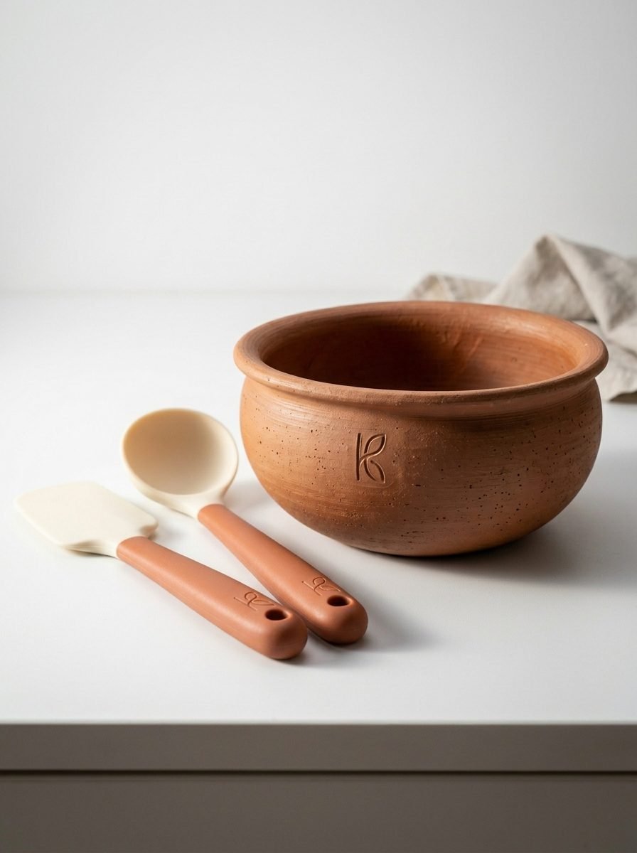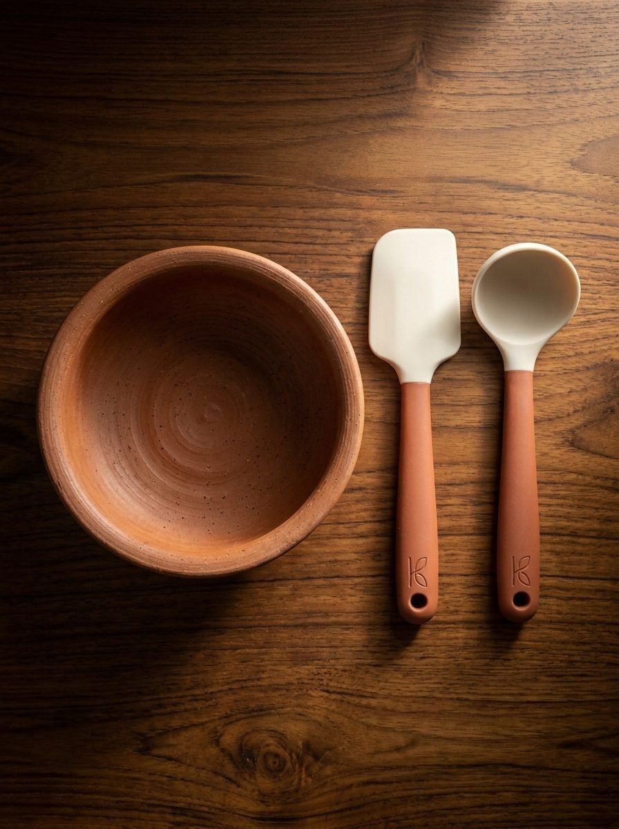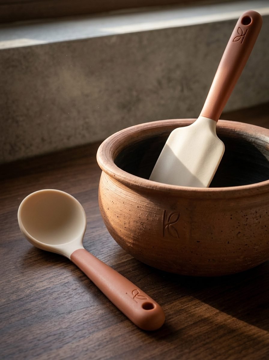 • Ergonomic Handle: Approximately 28cm total length. Long enough to keep your hand away from the rim of the handi or kadhai at high heat. The handle is 8mm diameter — thick enough to grip firmly during vigorous stirring, not so thick it feels unwieldy. About the Product The spatulas use platinum-grade food-grade silicone — the grade specified for medical and culinary applications, not the lower-grade silicone used in consumer kitchen products that can yellow or off-gas at high temperatures. The handle is a stainless steel core overmoulded with silicone — the steel provides rigidity, the silicone provides grip and heat insulation. The steel core is visible at the handle tip as a small silver circle — not a defect, a design feature that confirms the structural core. The Science The Ra ≤4µm surface roughness of Klayvi clay cookware is the result of specific surface preparation during making. Ra is the arithmetic mean surface roughness — at 4µm, this is approximately the smoothness of a well-seasoned cast iron pan. A 40 Shore A silicone spatula at this surface roughness deforms slightly on contact, conforming to the surface rather than dragging across it. This deformation is the protective mechanism: the spatula surface matches the clay surface rather than abrading it.